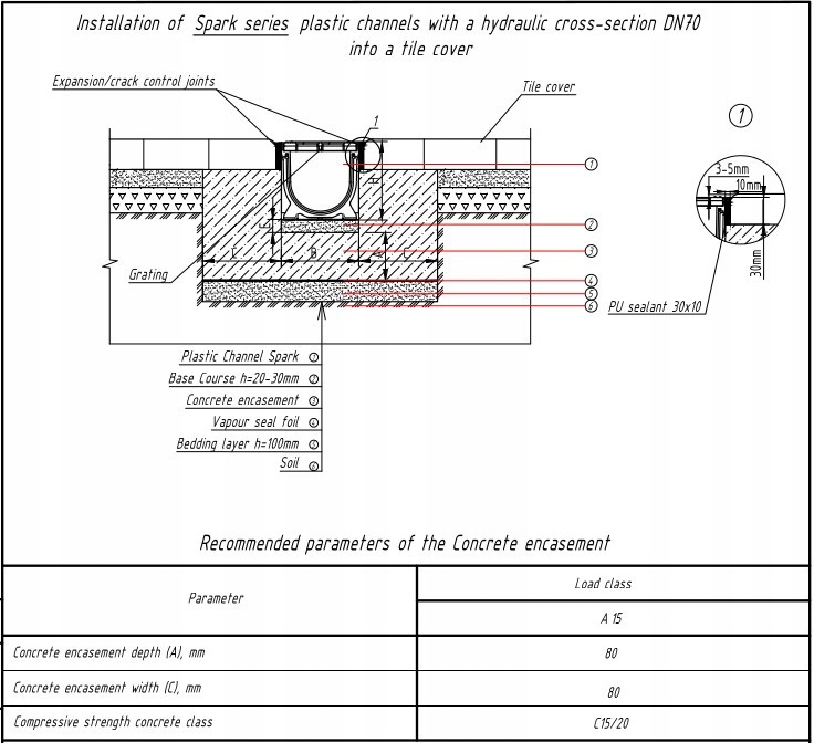 Пластмассовый лоток Easy1 DN70, решетка пластиковая, класс А15 Н90