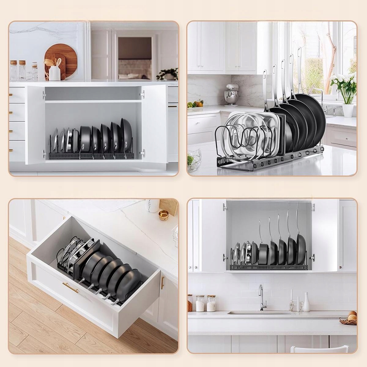 Наведите порядок в шкафу и сэкономьте место. Идеально подходит для размещения кастрюль, крышек, тарелок и разделочных досок под столешницами, шкафами и даже под раковиной.