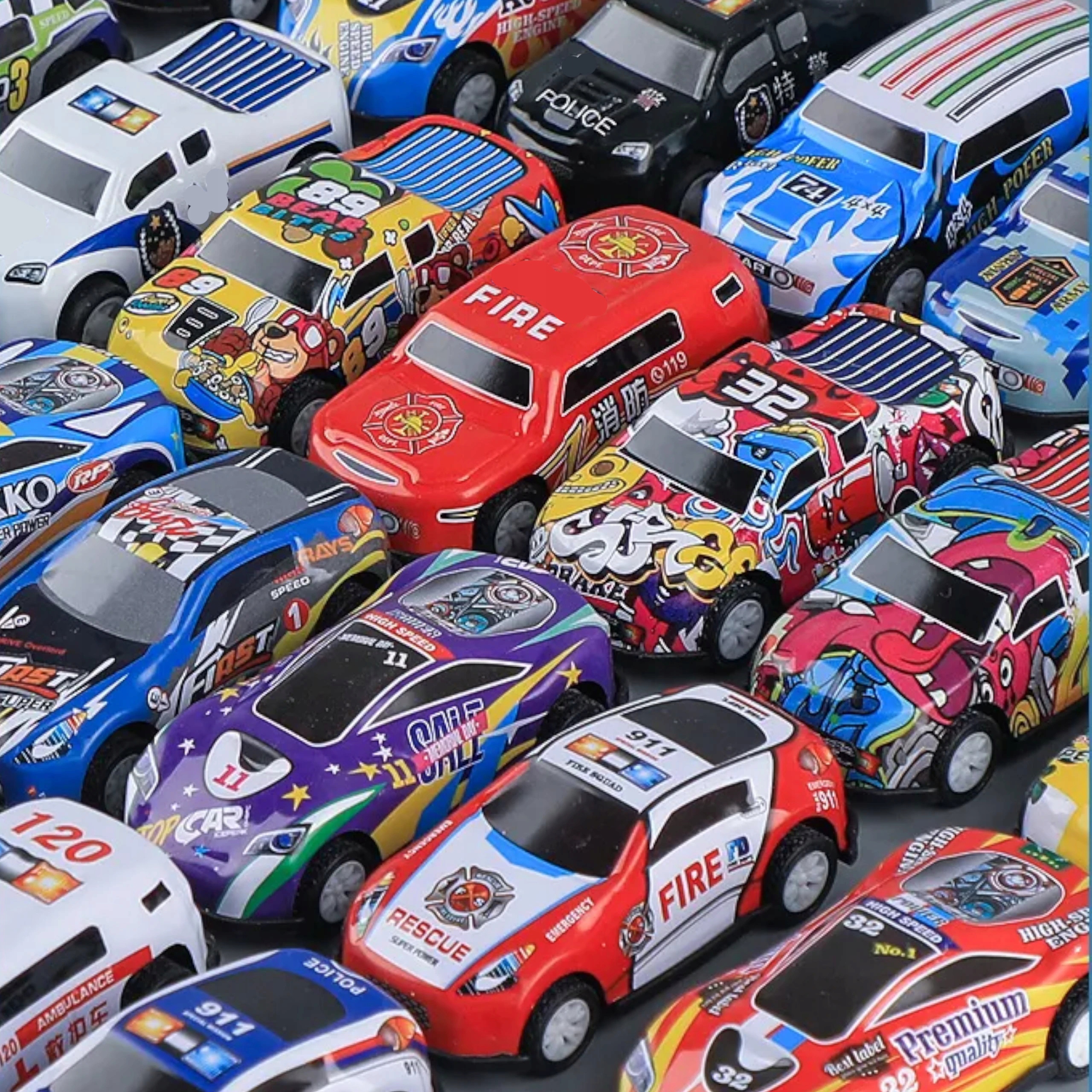 В набор входит целых 50 гоночных и внедорожников различных цветов и форм. Машины можно приводить в движение благодаря механизму отвода назад. Чтобы привести машину в движение, просто потяните ее назад по полу и отпустите.