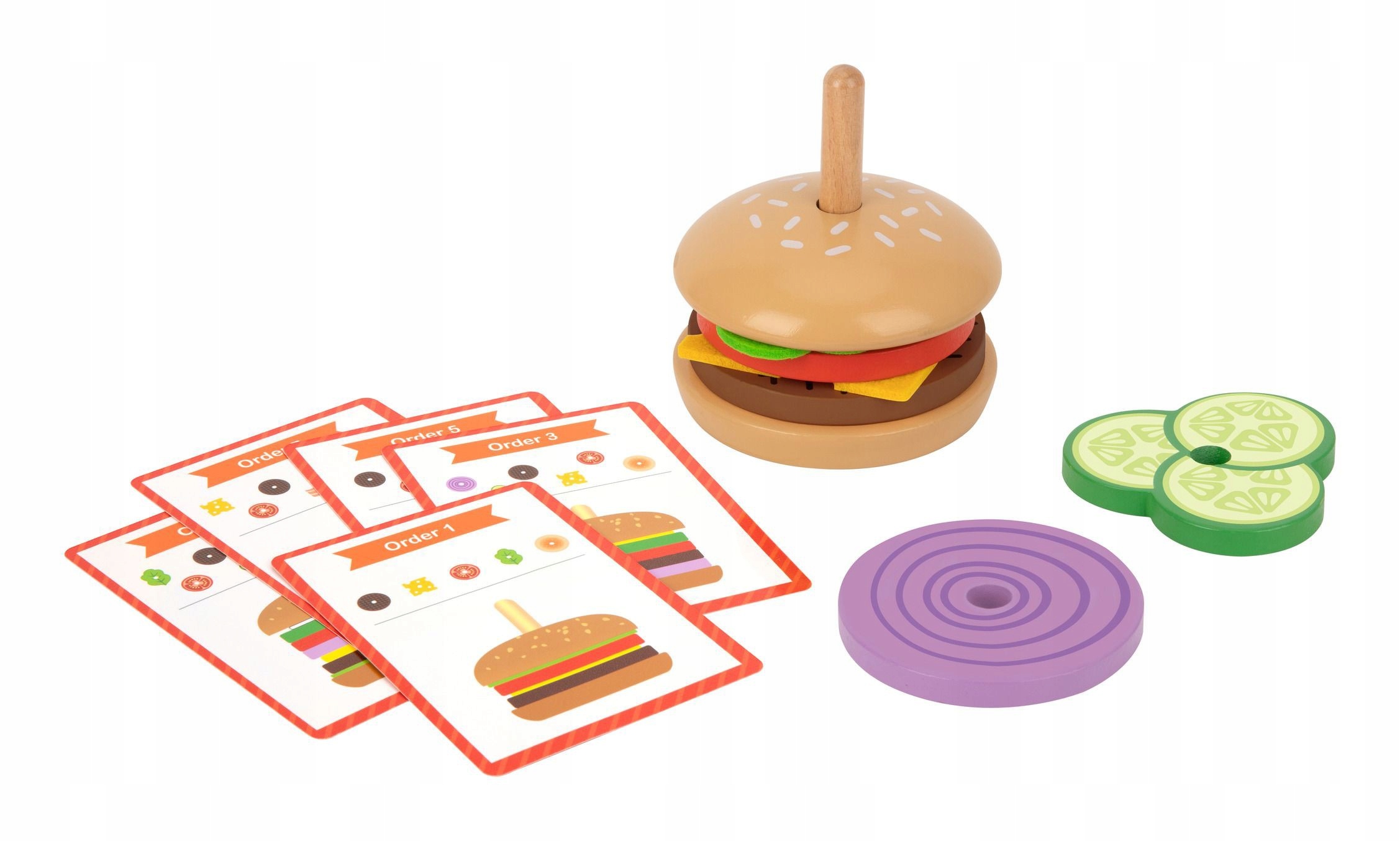 - набор содержит 15 деталей: 2 булочки для бургера, 8 ингредиентов для бургера и 5 карточек с 10 узорами
