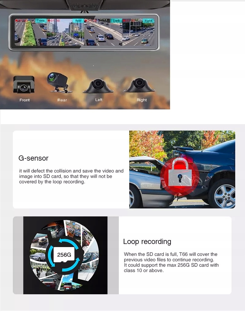 4 камеры записывают одновременно, панорамный вид на 360° с 4 камерами, записывающими одновременно, что означает, что длинные видео с 4 камеры будут сохранены на SD-карте. Четыре изображения будут отображаться на 12-дюймовом дисплее в соотношении 1:1:1:1. 【G-сенсор】 Я запишу столкновение и сохраню видео и изображение на SD-карту, чтобы на них не повлияла циклическая запись. 【Циклическая запись】Когда SD-карта заполнена, предыдущие видеофайлы будут перезаписаны для продолжения записи. Он может поддерживать SD-карты макс. 256 ГБ класса 10. 1. Подходит для напряжения 9-36 В. 2. Питание осуществляется от автомобильного аккумулятора, а провод ACC подключается к ключу зажигания. 3. Поддерживается четырехсегментное, одноэкранное и другое сегментированное отображение видео или изображений. 4. Разрешение дисплея 1920*720P. 5. Имеются триггерные провода ACC для парковки задним ходом, поворота налево и поворота направо. при автоматическом реверсе он переключится на изображение задней камеры с парковочной линией для справки. При повороте налево или направо на экране для проверки будет отображаться изображение с левой или правой камеры. 6. Поддерживает карту макс. 256 ГБ для записи видео. 7. Формат видео — MOV и код H.264. Видеофайлы можно воспроизводить на компьютере. Описание: Экран: 12-дюймовый сенсорный экран Операционная система: UC Диапазон мощности: 9–36 В Формат видео: H.264, MOV Разрешение видео: AHD 1280x720P Стандарт видео: ISO14496-10 Аудиовход: Поддержка видеовхода: CH1-CH4, поддержка AHD Хранение видео: поддержка карт емкостью до 256 ГБ класса 10 или более высокая Рабочая температура: -20 ℃ ~ 80 ℃. Режим отображения: поддержка 4-сегментного, 2-сегментного или полноэкранного видеодисплея. Цвет: черный. Материал: АБС-пластик. Комплектация: специальный кронштейн не входит. 1 инструкция на польском языке.
