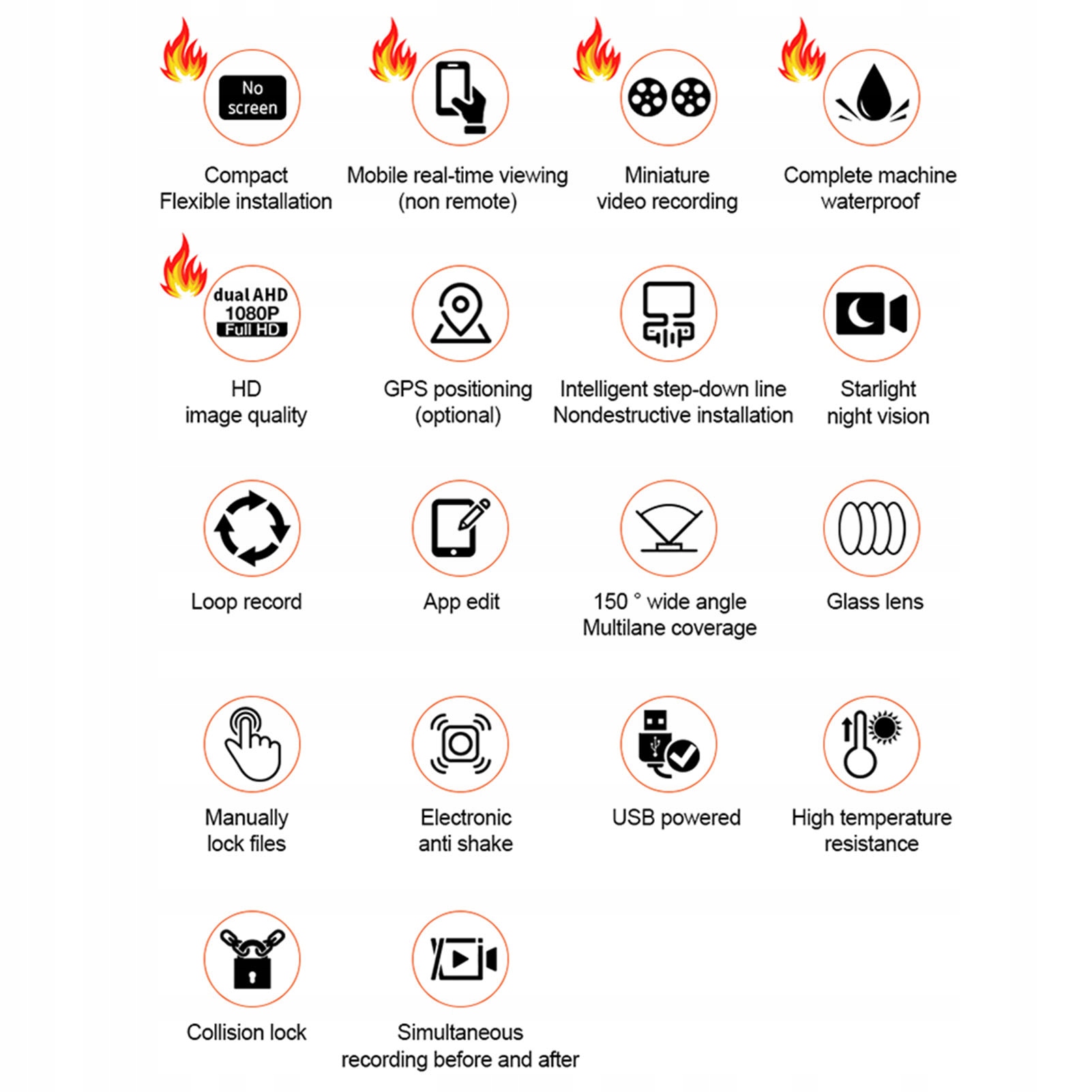 1.Качество изображения: камера записывает спереди и сзади с разрешением HD 2 мегапикселя, включая 2 камеры для одновременной записи спереди и сзади автомобиля. 2. Водонепроницаемый дизайн: основной блок имеет степень защиты IP65, объектив и кабель водонепроницаемы по стандарту IP67 и полностью герметичны, чтобы предотвратить попадание пыли и брызг воды под низким давлением. 3. Стабильное изображение. Встроенная функция стабилизации изображения эффективно компенсирует дрожание камеры, обеспечивая плавное и стабильное изображение, идеально подходящее для ухабистых дорог и тротуаров. 4. Мониторинг парковки: записывающая камера может контролировать территорию вокруг автомобиля во время парковки и записывать окрестности, чтобы обеспечить безопасность. 5. Надежная камера: двойные камеры HD 1080P обеспечивают четкое изображение и отличную детализацию, обеспечивая идеальное визуальное восприятие, подходящее для всех мотоциклов, UTV, квадроциклов, тележек для гольфа.