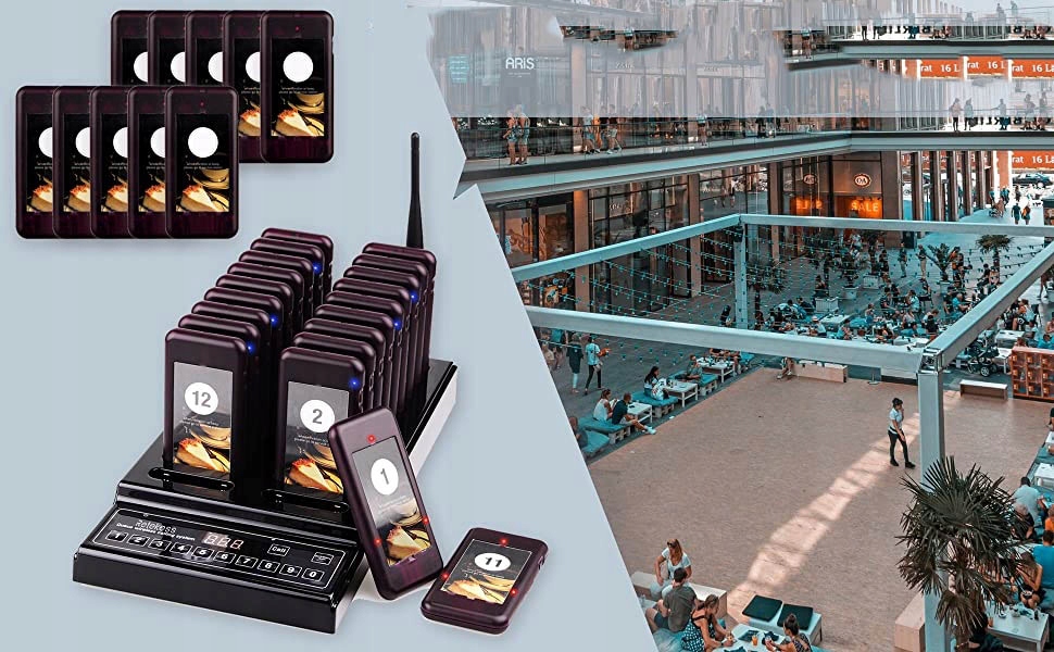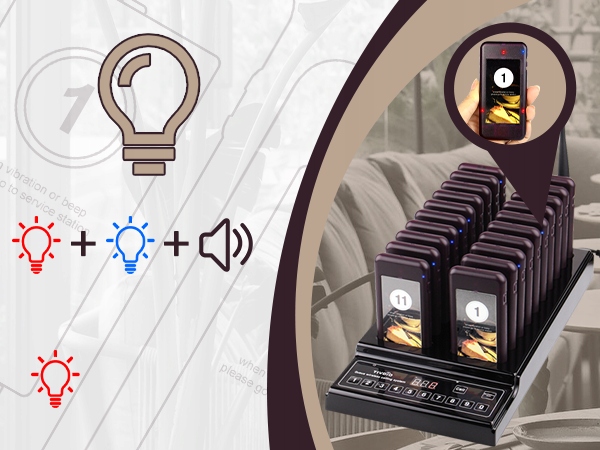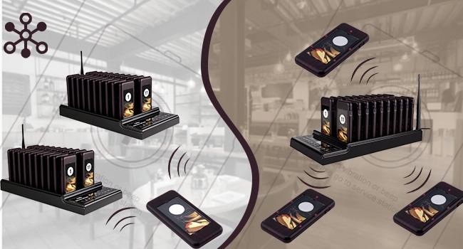 30-пейджерная беспроводная система вызова лучше подходит для большого ресторана; с помощью системы пейджинговой очереди вы можете обслуживать 30 клиентов одновременно вместо 20 клиентов.