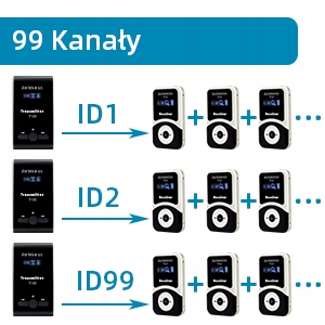 Существует 99 каналов на выбор, которые могут использоваться 99 командами одновременно. Передатчик может получать много приемников в радиусе 60 метров и расширять приемник в соответствии с требованиями. Количество приемников может быть добавлено без ограничений.