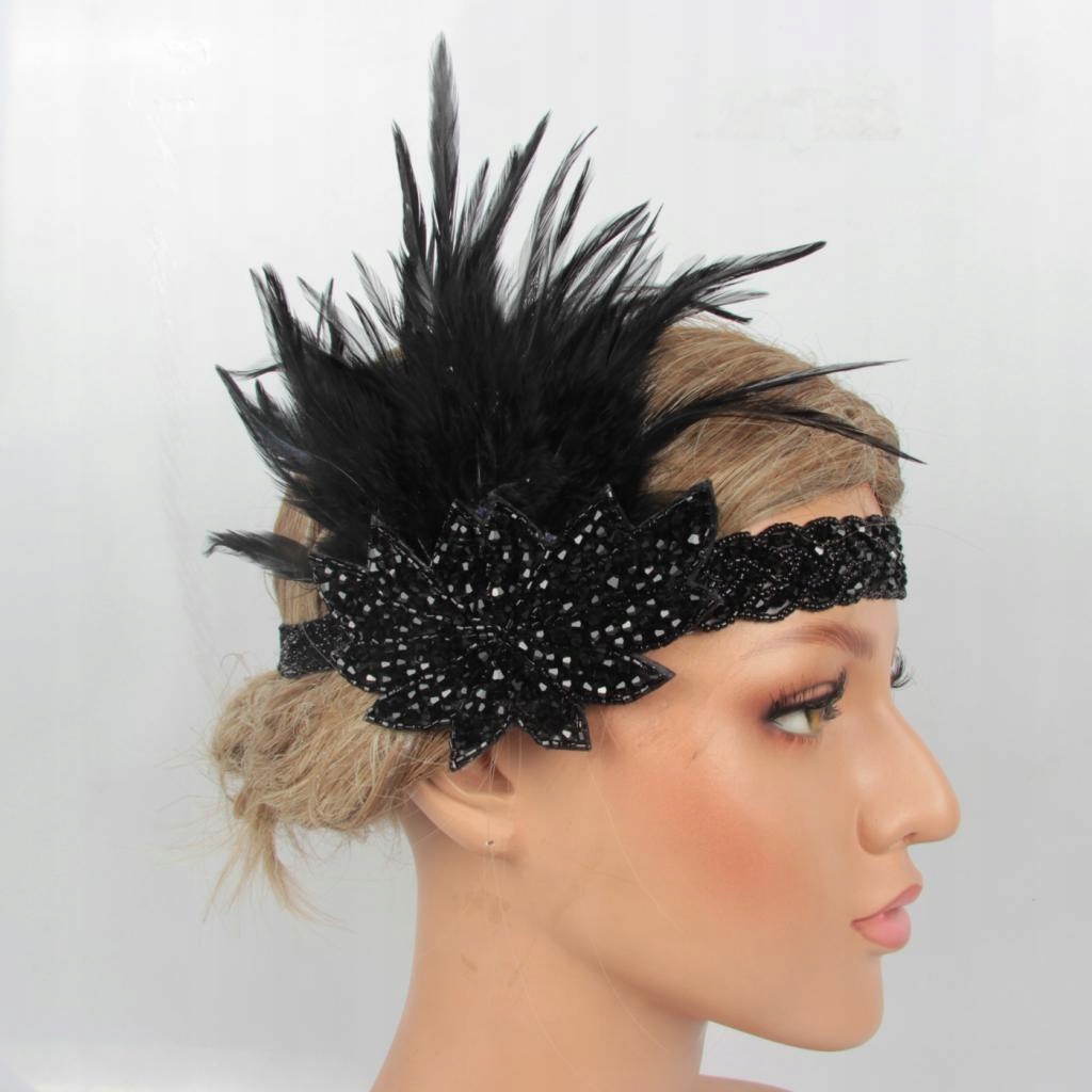 Изготовлен из гибкой ленты с черными цирконами и высококачественными черными перьями с перьями в стиле 1920 -х/30. Двадцатый век заставит вас больше взглянуть на ваше зрение