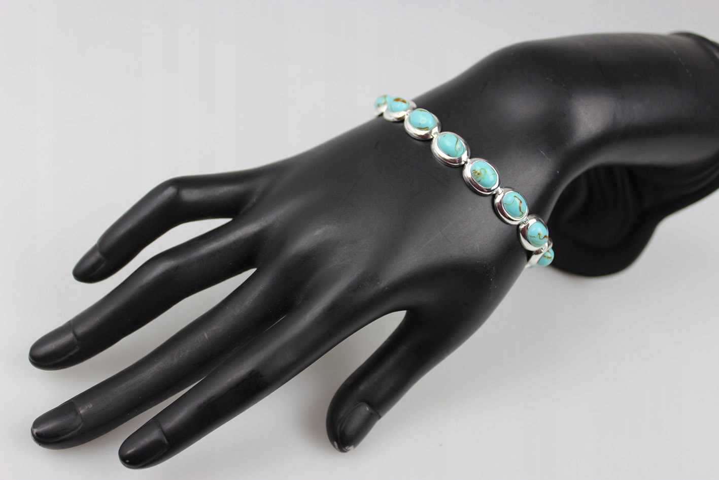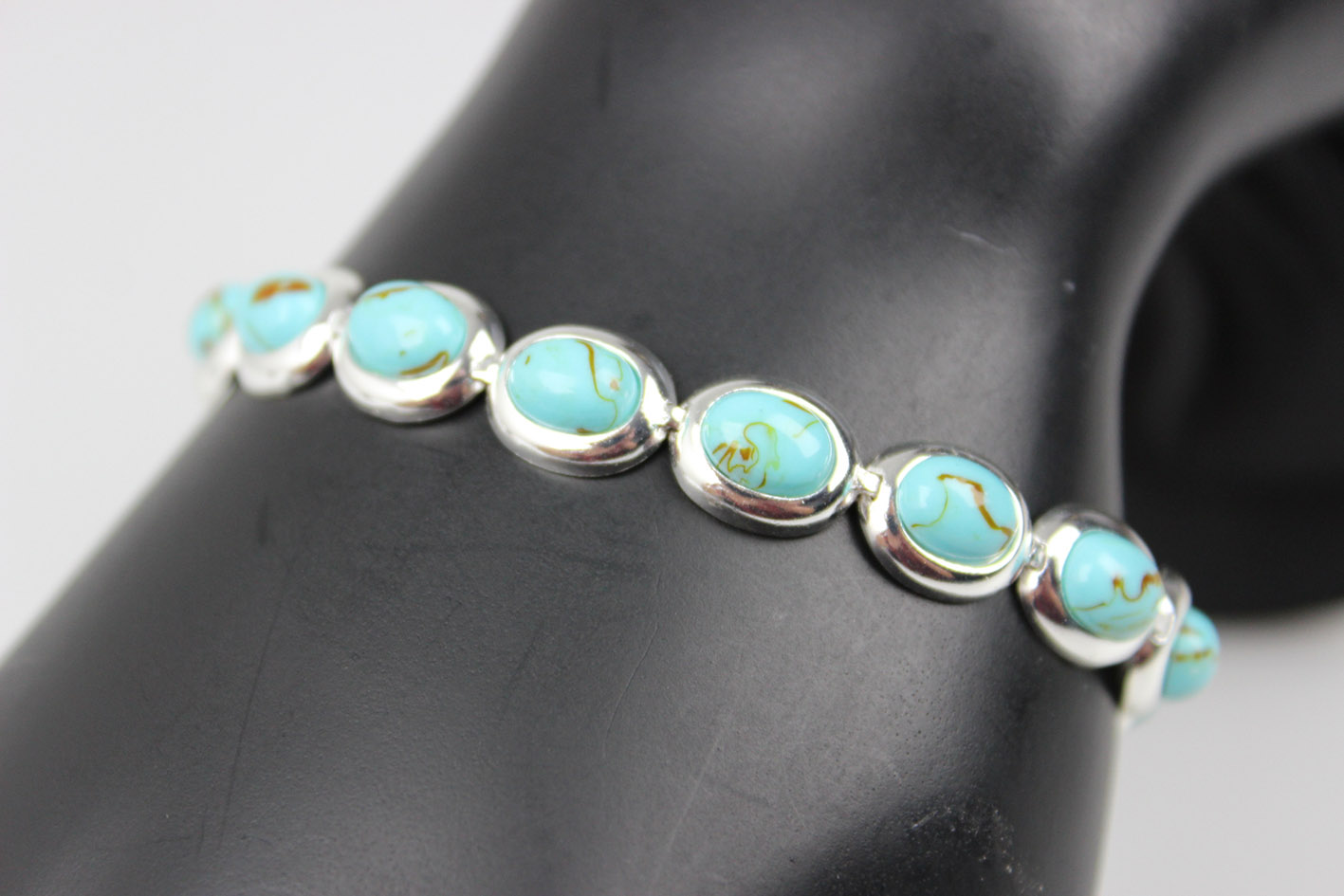 Элегантный браслет от известной фабрики FAS Thai 1990-х годов из серебра 925 пробы с изящным родиевым покрытием, придающим блеск и защищающим от потемнения. Овальные звенья украшены натуральной бирюзой огранки кабошон теплого сине-зеленого цвета с характерным рисунком прожилок.