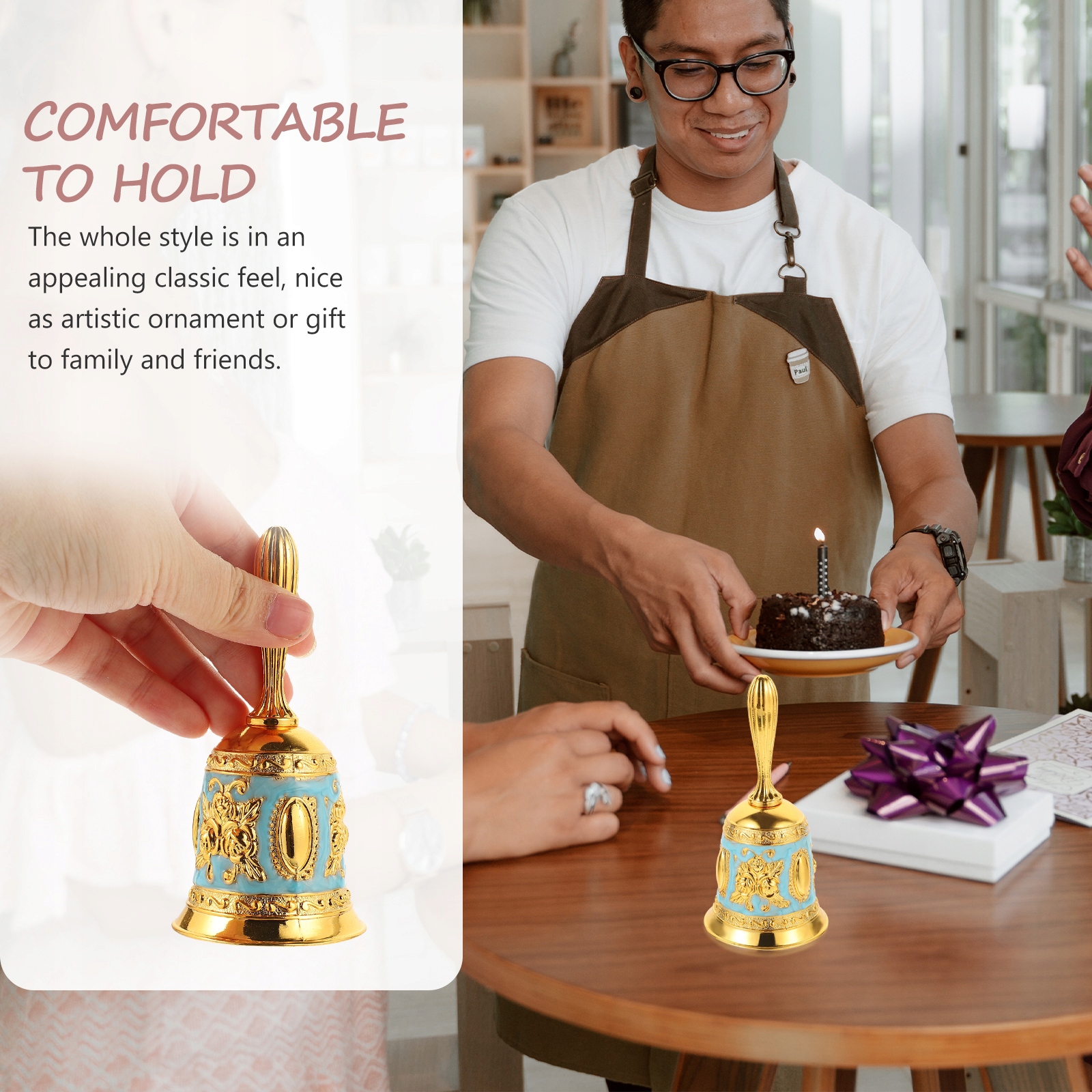 Изысканная ручка обеспечивает удобный захват, когда вы неоднократно встряхиваете колокольчик, чтобы привлечь внимание окружающих.