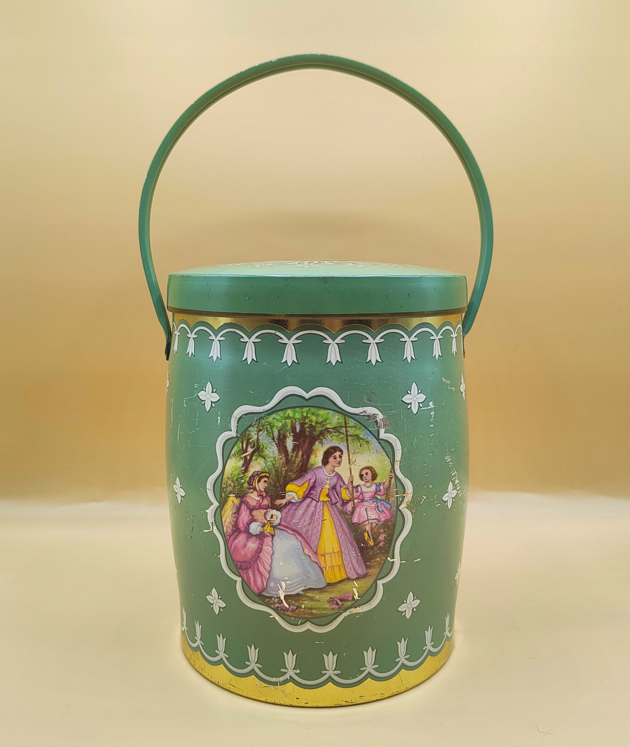 Потрясающая РЕТРО банка, две дамы с ребенком на детской площадке. Банка/ведро с ручкой.