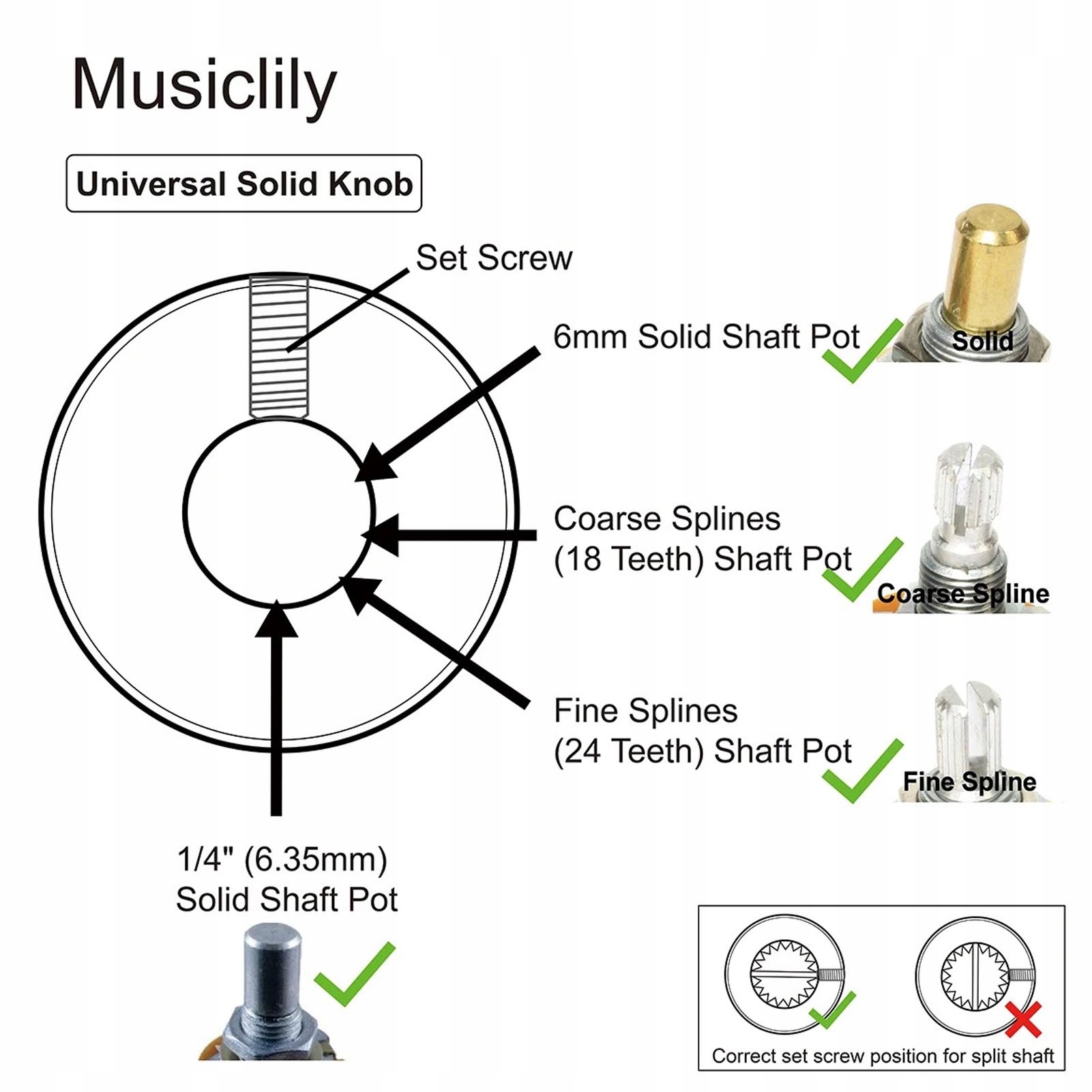 2. Универсальная совместимость: ручки ведьмин шляпы, предназначенные для использования с различными потенциометрами, подходят для потенциометров с твердым валом 1/4 дюйма, а также потенциометров с потенциальным валом 6 мм (15/64 дюйма), включая типы с грубыми и мелкими шлицами. Такая гибкость делает их пригодными для различных применений на электрогитарах, бас-гитарах, усилителях и педалях эффектов.