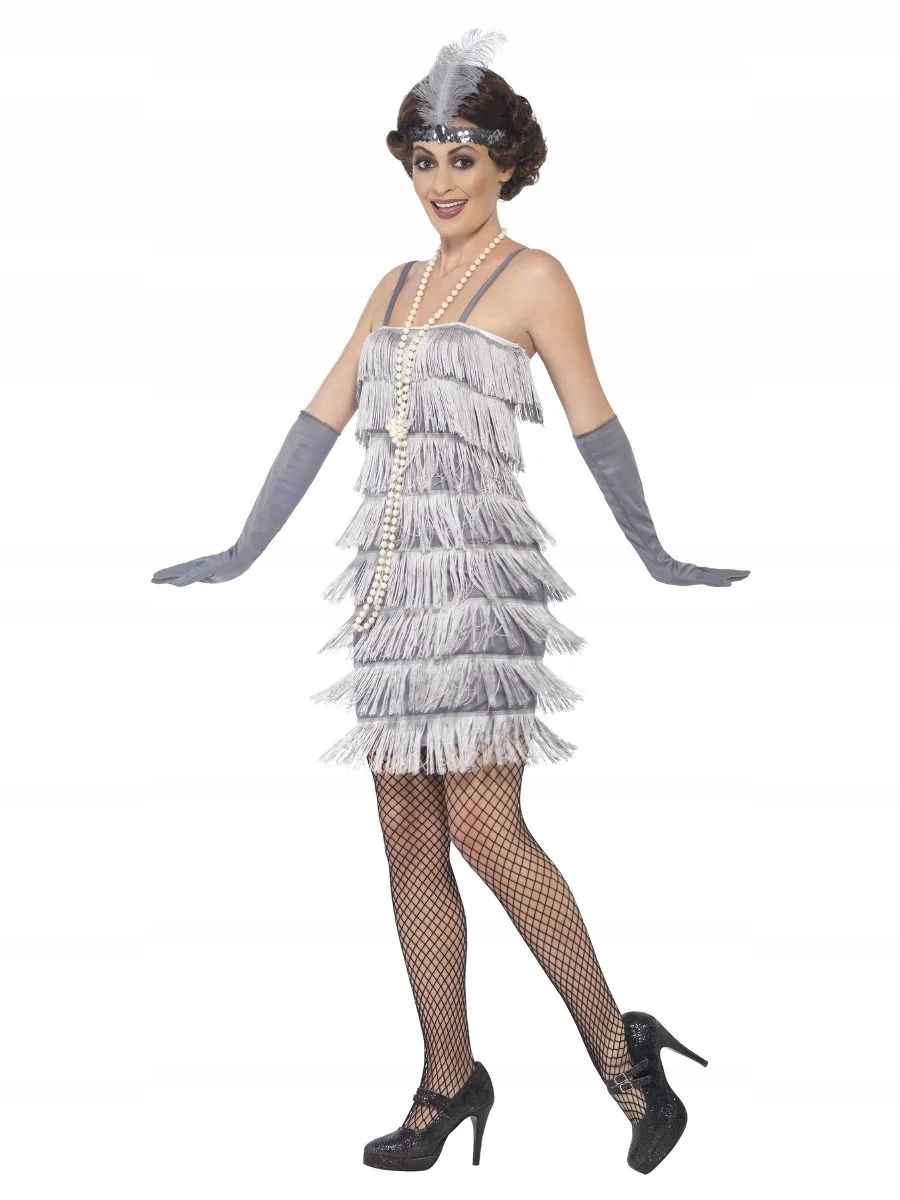 Костюм-флэппер Маскировка гангстера для взрослых Костюм 1920-х годов Элегантное платье длиной до колен, украшенное бахромой стального цвета – билет в безумное веселье 1920-х и 1930-х годов. Дополните комплект шарфом с перьями и позвольте себе увлечься вечеринкой в стиле Джея Гэтсби.