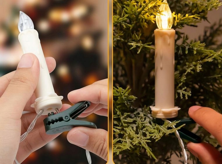 Каждая свеча поставляется с зажимом, который позволяет легко прикрепить их, чтобы создать вид рождественской елки, мгновенно освещая ваше пространство.