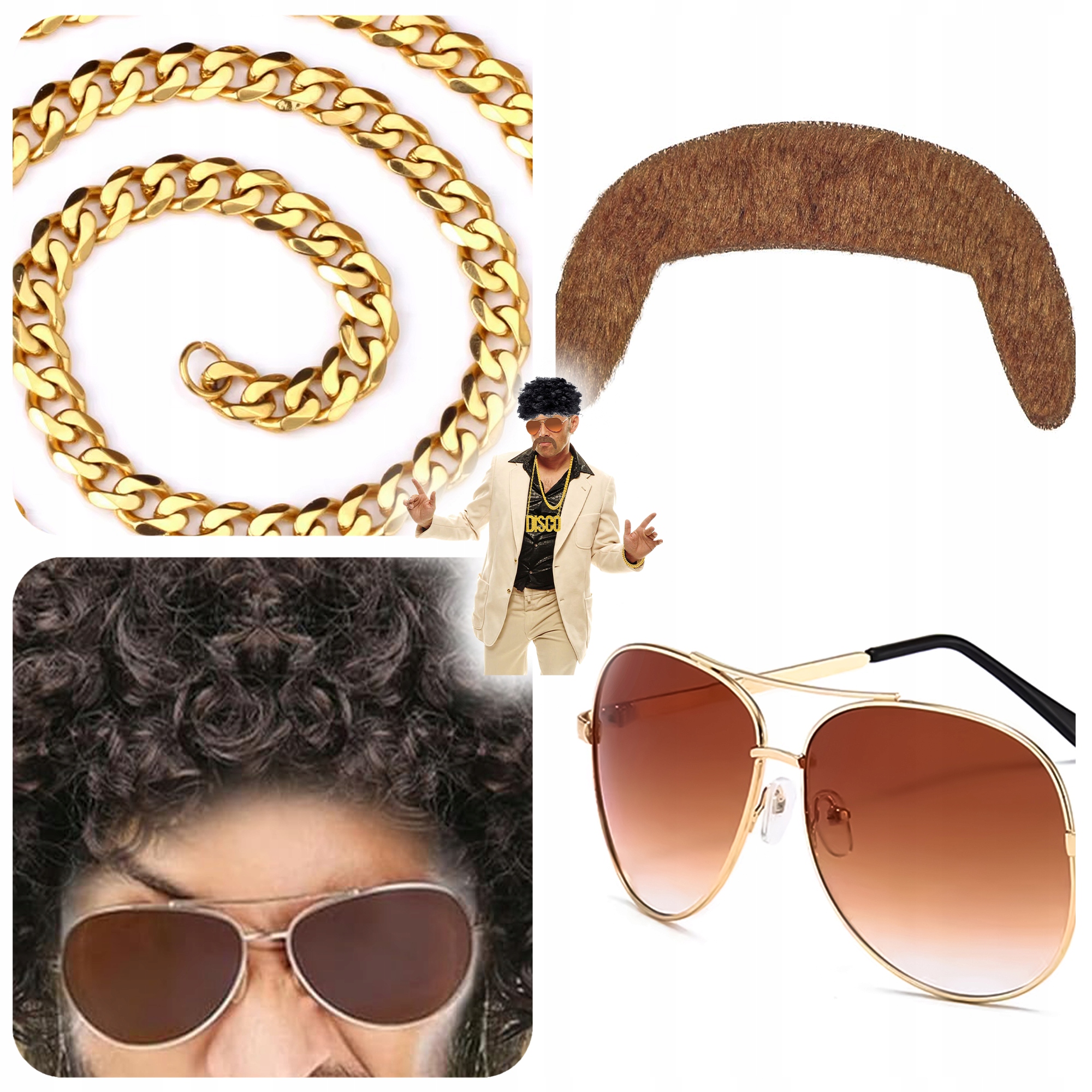 • Состав комплекта: парик, очки, цепочка, колье «ДИСКО», усы, браслет, кольцо.