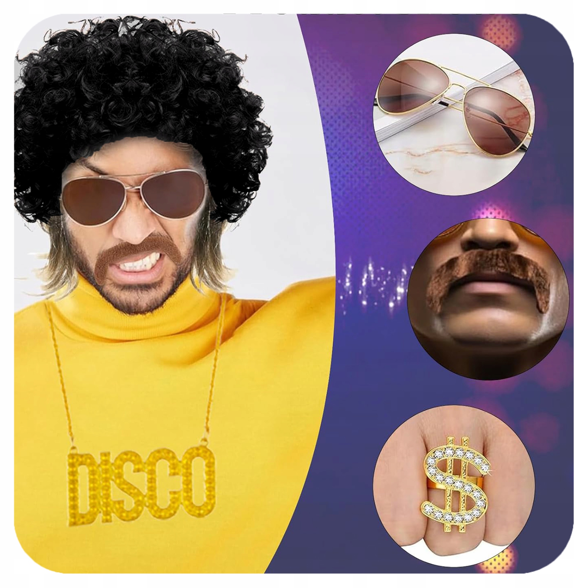 • Афро-парик, очки и золотые аксессуары создают привлекательный образ, который выделит вас на любом танцполе.