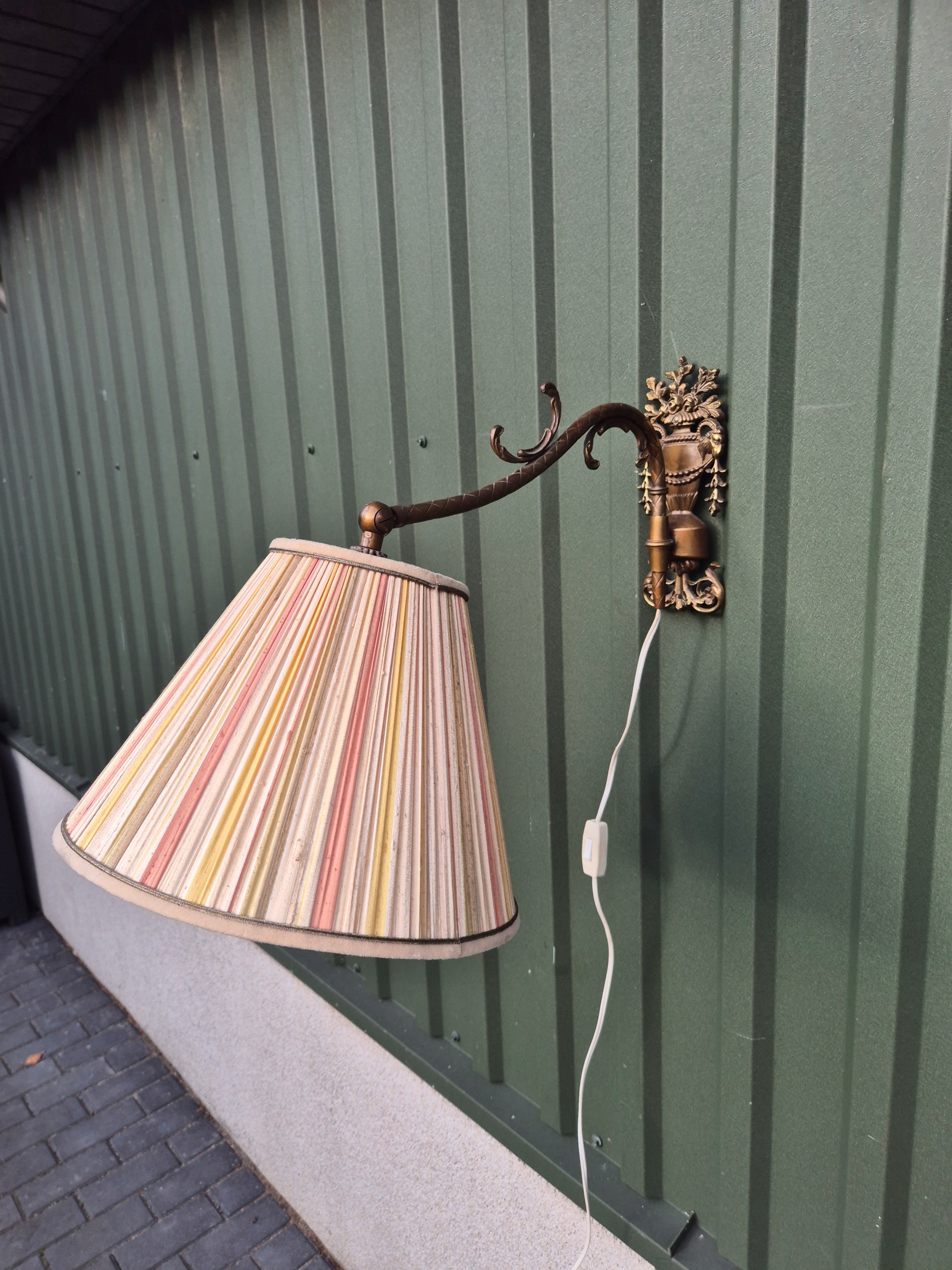 Декоративный настенный светильник в стиле ретро с декоративным латунным кронштейном и тканевым абажуром в теплых тонах. Светильник с выключателем на кабеле, готов к использованию.