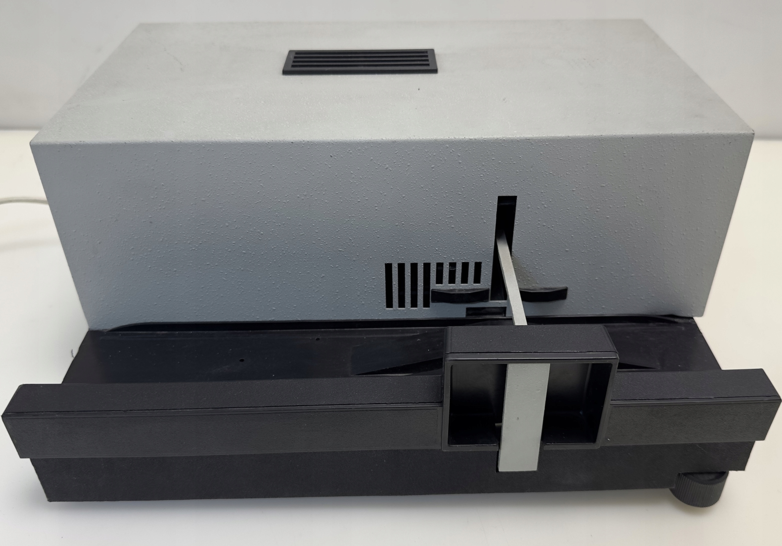 ТЕХНИЧЕСКОЕ СОСТОЯНИЕ - Устройство запускается, лампа работоспособна. Ручная смена пленки работает нормально. Механизм смены пленки с пульта имеет большое сопротивление и не может поменяться. Пульт работает хорошо.Отсутствует линза.
