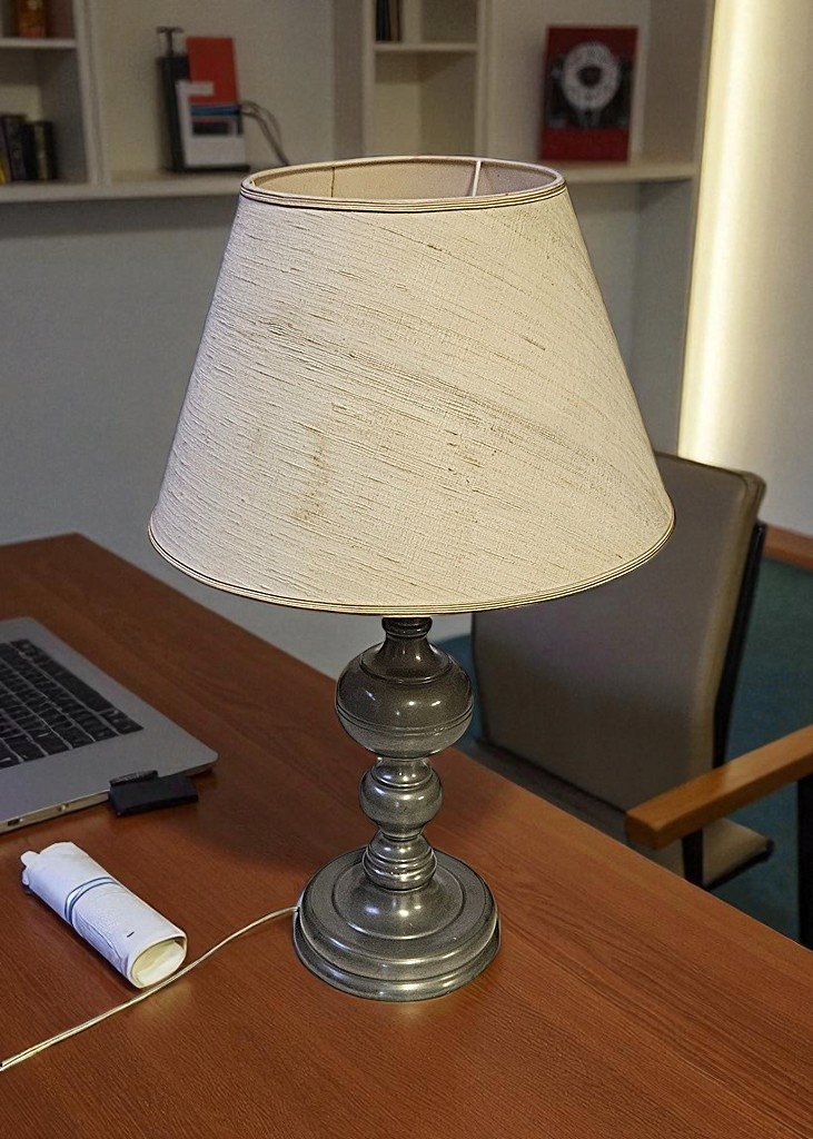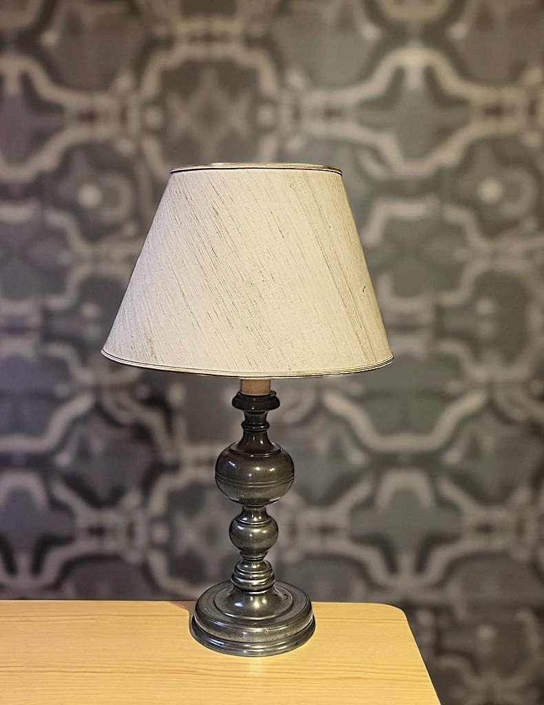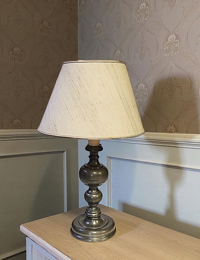 Светильник использован - ножка из тёмно-серебристого металла. Состояние лампы хорошее (на фото видно утрату пластика в патроне), абажур тоже в хорошем состоянии - НАСТОЯТЕЛЬНО РЕКОМЕНДУЮ.