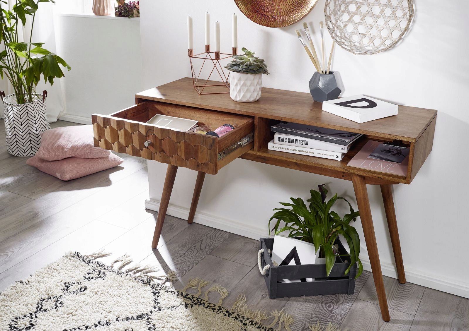 Консоль новая. Изготовлен полностью из массива акации, дополнительно покрыт лаком. Днища и спинки ящиков изготовлены из мебельной фанеры. Консоль выполнена в стиле РЕТРО, плавно изогнутые, точеные ножки, отсылающие к 1960-м годам. Естественные сучки и трещины в древесине оставлены намеренно. Мозаика ручной работы на ящиках добавляет дополнительный шарм. К консоли требуется только прикрутить ножки, которые для безопасной доставки снимаются.