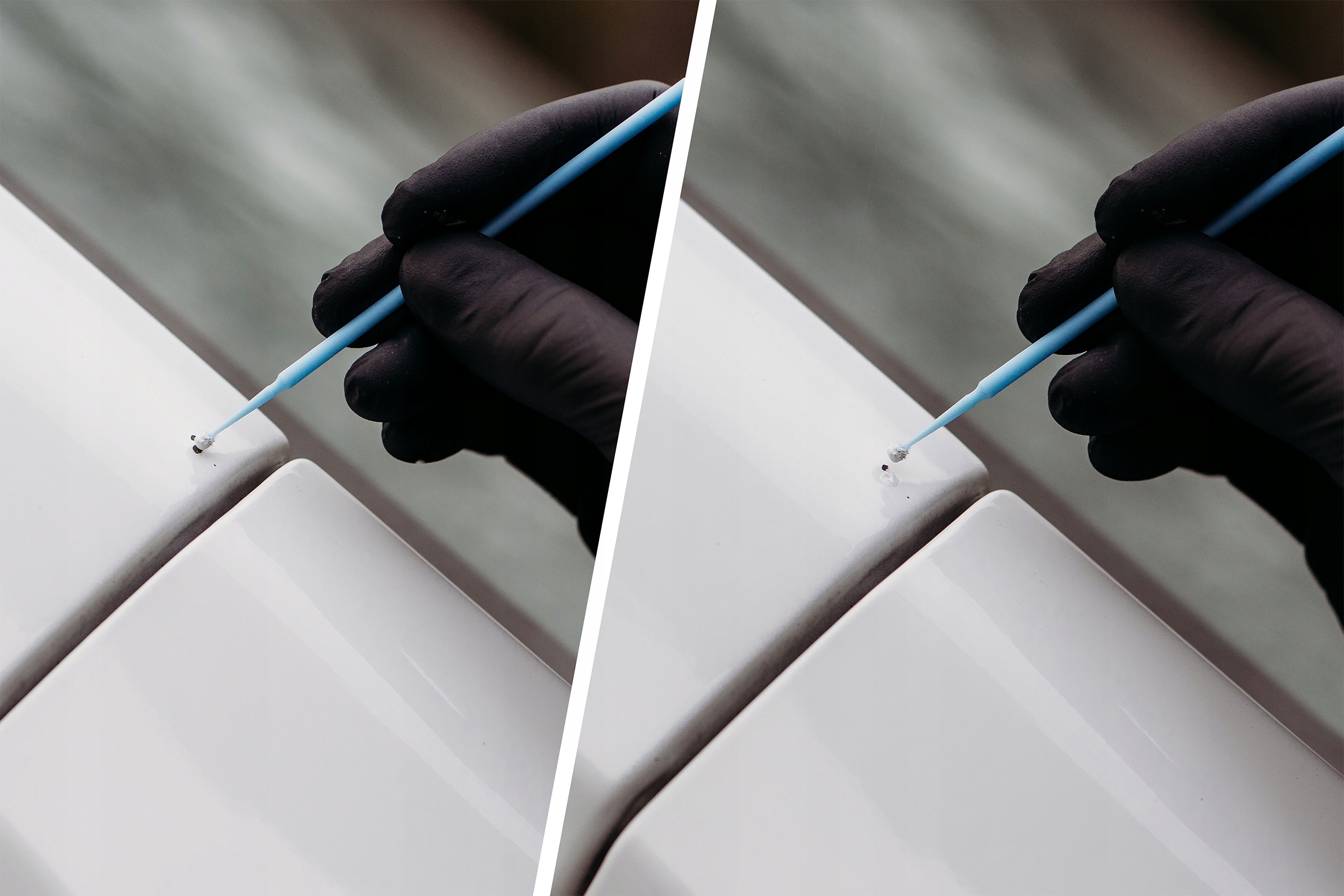 5️⃣ Нанесите кистью один-два тонких слоя, тщательно покрывая ремонтируемый участок.