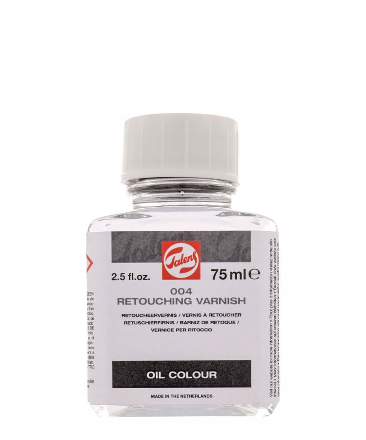 Ретуширующий лак «Таленс» позволяет устранить матовость поверхностей и обеспечивает временную защиту еще не полностью высохших картин, написанных масляными красками. Использование лака не влияет на время высыхания краски – сам лак высыхает в течение нескольких часов. После повторного нанесения лака его можно будет использовать только в качестве временной защиты через 2-3 месяца. Не желтеет. Его можно разбавить уайт-спиритом, которым следует очищать кисти после нанесения лака. Продукт очень легко воспламеняется.