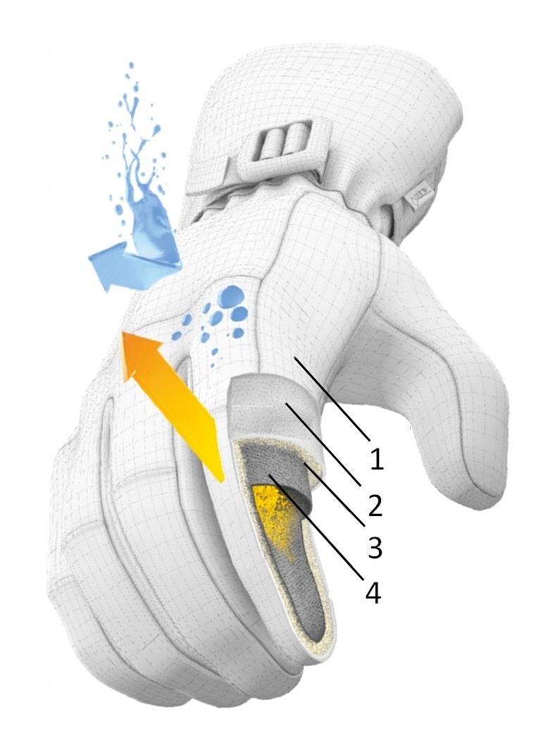 перчатки повторно обеспечивают высокую защиту от погодных условий (ветер, холод, влага), в то время как правильная терморегуляция внутри перчатки для поддержания наивысшего комфорта. Перчатки состоят из четырех основных слоев, последовательно подключенных друг к другу: