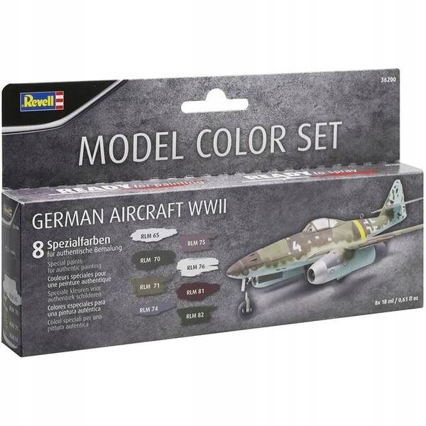 Набор модельных красок, предназначенный для окраски немецких самолетов времен Второй мировой войны, каталожный номер 36200, представляет собой специально подобранный ассортимент цветов, позволяющий моделистам достоверно воссоздать характерную атмосферу немецких Люфтваффе времен Второй мировой войны. Этот набор состоит из восьми различных цветов, включая эксклюзивные оттенки, доступные только в этой специальной коллекции и недоступные в стандартном предложении Revell.