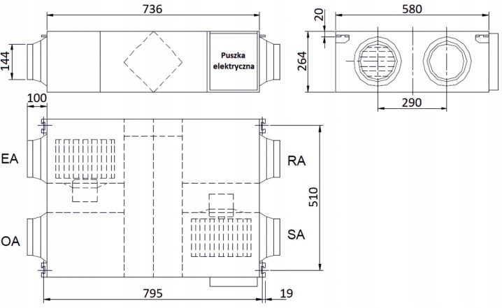 Размеры без патрубков (ширина x высота x длина): 580 мм x 264 мм x 736 мм