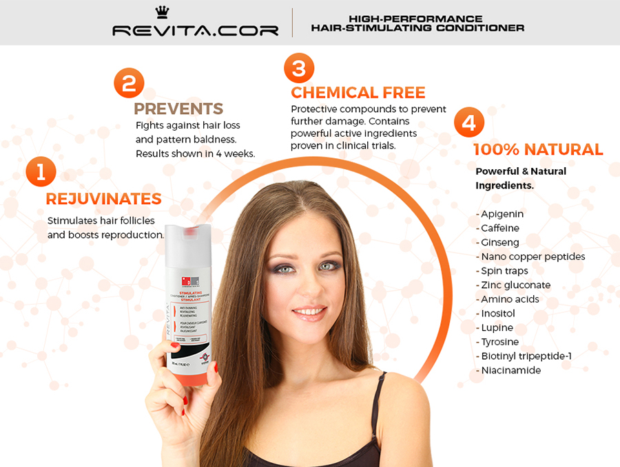 Специализированный, высокотехнологичный кондиционер Revita COR ®, который стимулирует рост волос и останавливает облысение.