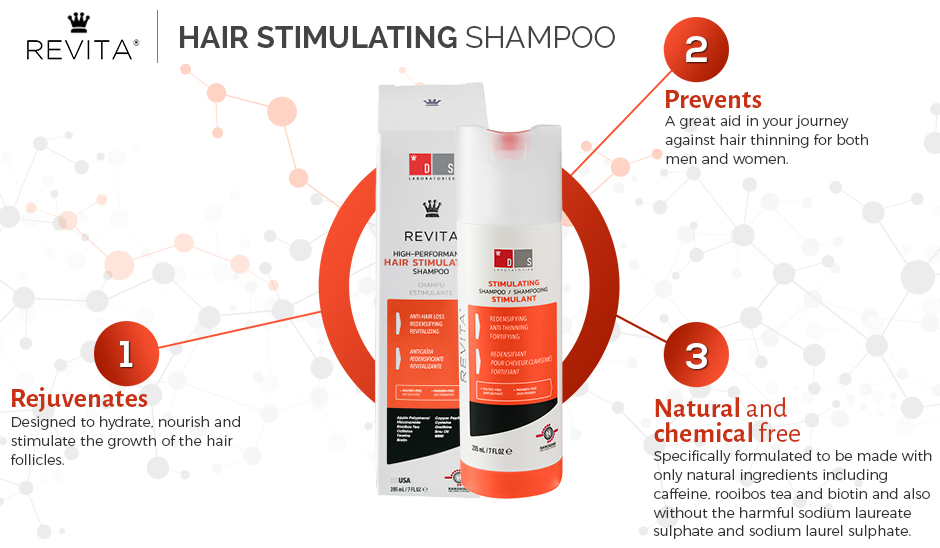 Ревита® — единственный шампунь, который сочетает в себе сильное действие против ДГТ (производное тестостерона, вызывающее выпадение волос) с антиоксидантным и противовоспалительным действием. Шампунь Revita® сочетает в себе стимулирующий рост волос эффект с сильными увлажняющими свойствами и обеспечивает незаменимые аминокислоты, что приводит к увеличению толщины отдельных волос. Этот комплексный механизм действия обеспечивает кожу головы необходимыми питательными веществами и стимулирует рост волос.