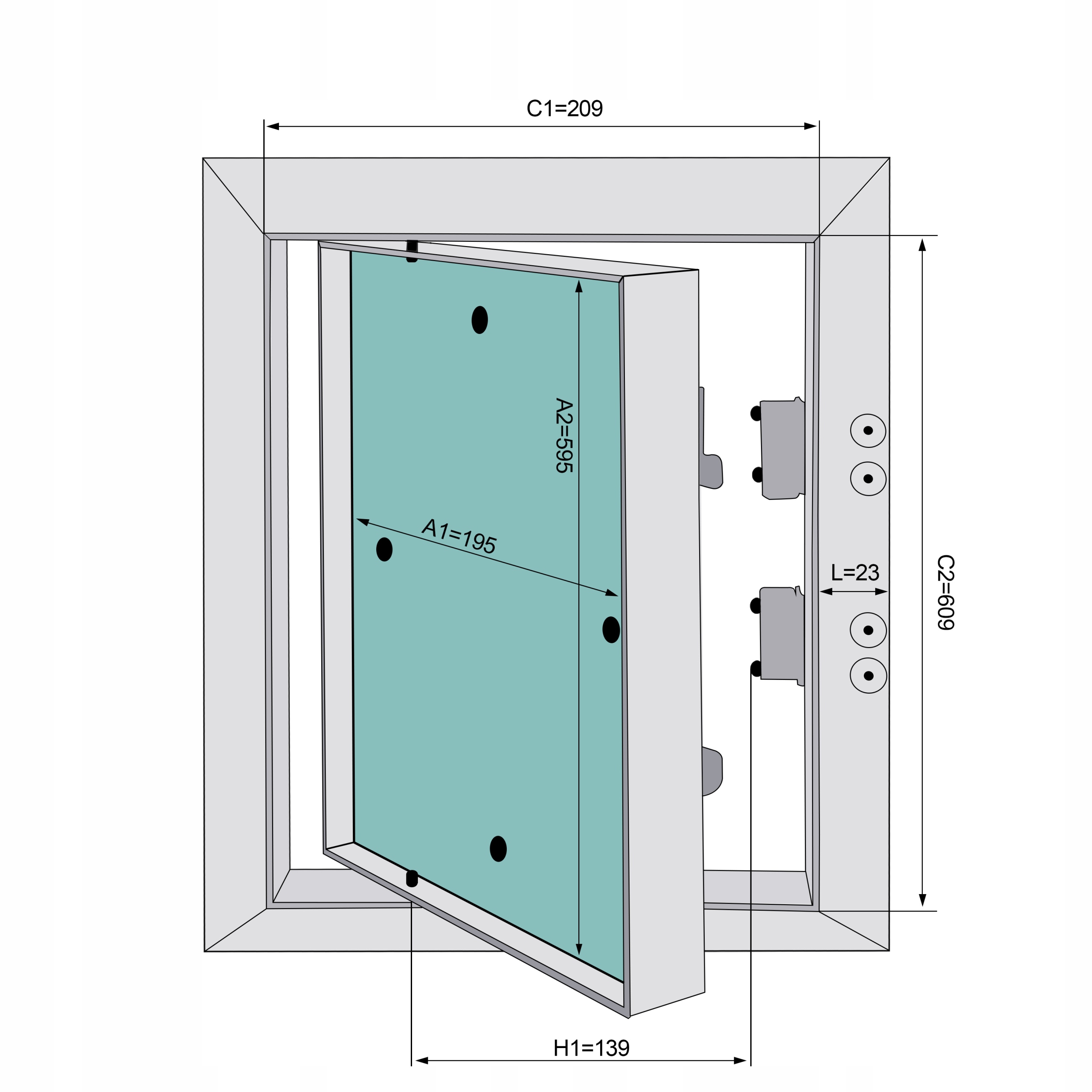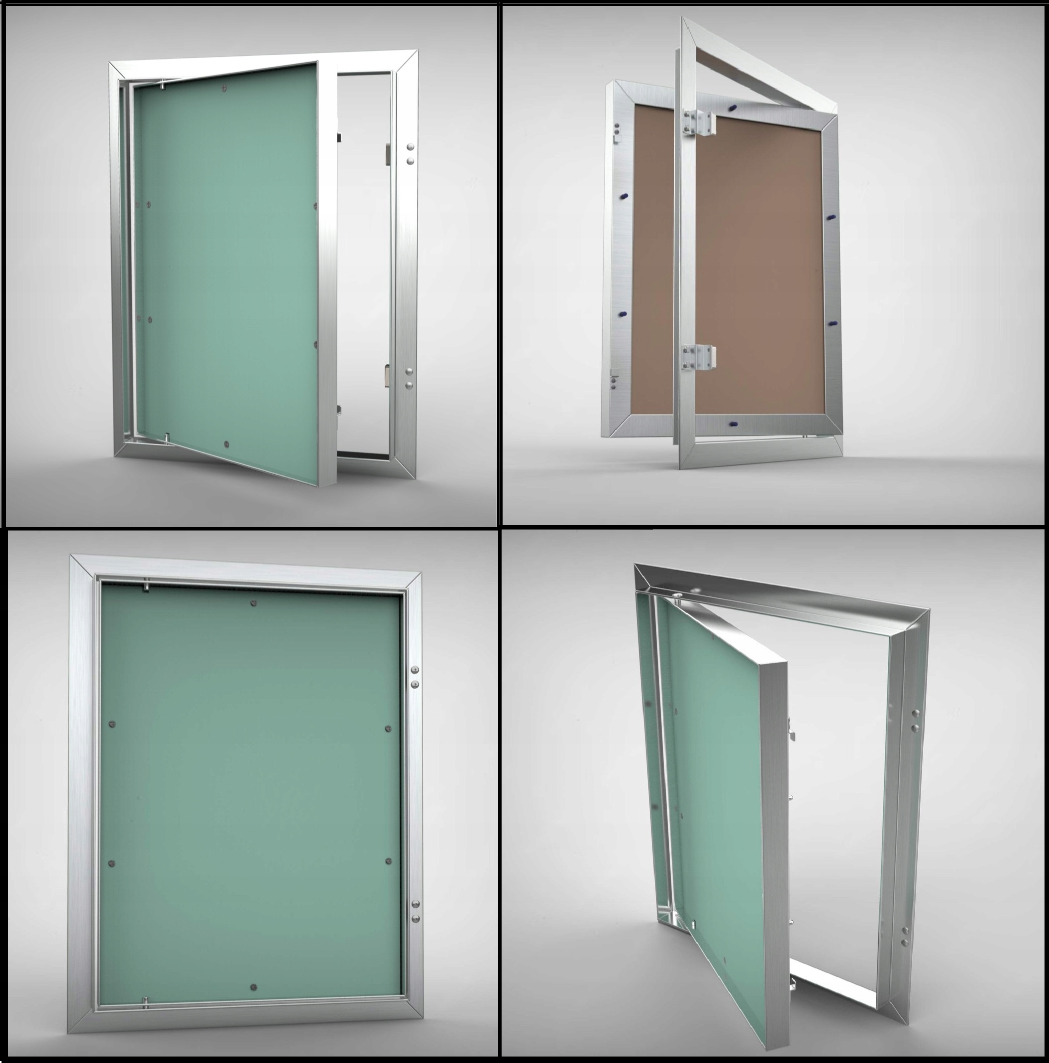 Ревизионные двери изготовлены из алюминиевых профилей, приваренных к внешней и внутренней раме. Вся конструкция соединена неподвижными петлями, позволяющими при необходимости открывать дверь в сторону. Данная модель оснащена зеленым водонепроницаемым и пропитанным гипсокартоном толщиной 12,5 мм.