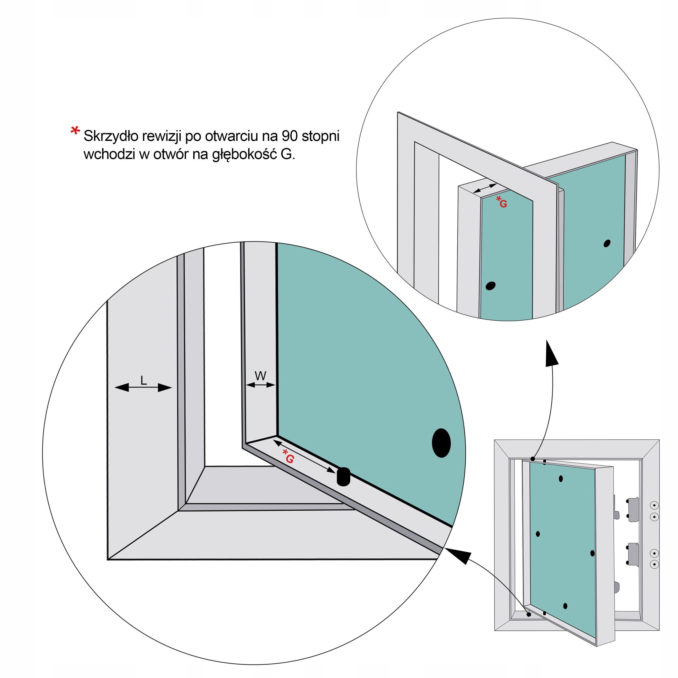 Ревизионные двери изготовлены из алюминиевых профилей, приваренных к внешней и внутренней раме. Вся конструкция соединена неподвижными петлями, позволяющими при необходимости открывать дверь в сторону. Данная модель оснащена зеленым водонепроницаемым и пропитанным гипсокартоном толщиной 12,5 мм.