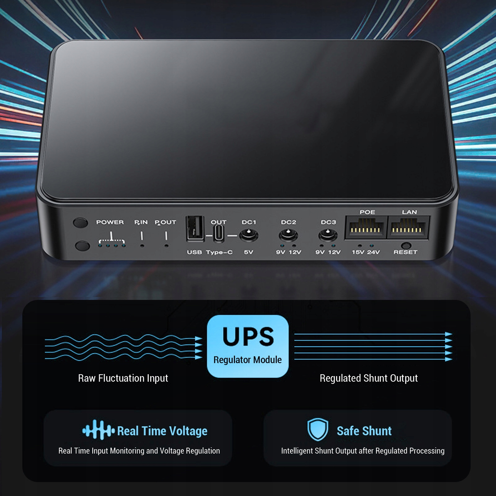 6. Двойной источник питания для устройства: UPS Однорелизованный источник питания может одновременно подавать питание для двух устройств с функцией предотвращения чрезмерной зарядки и короткого замыкания, обеспечивая безопасную работу обоих выходов.