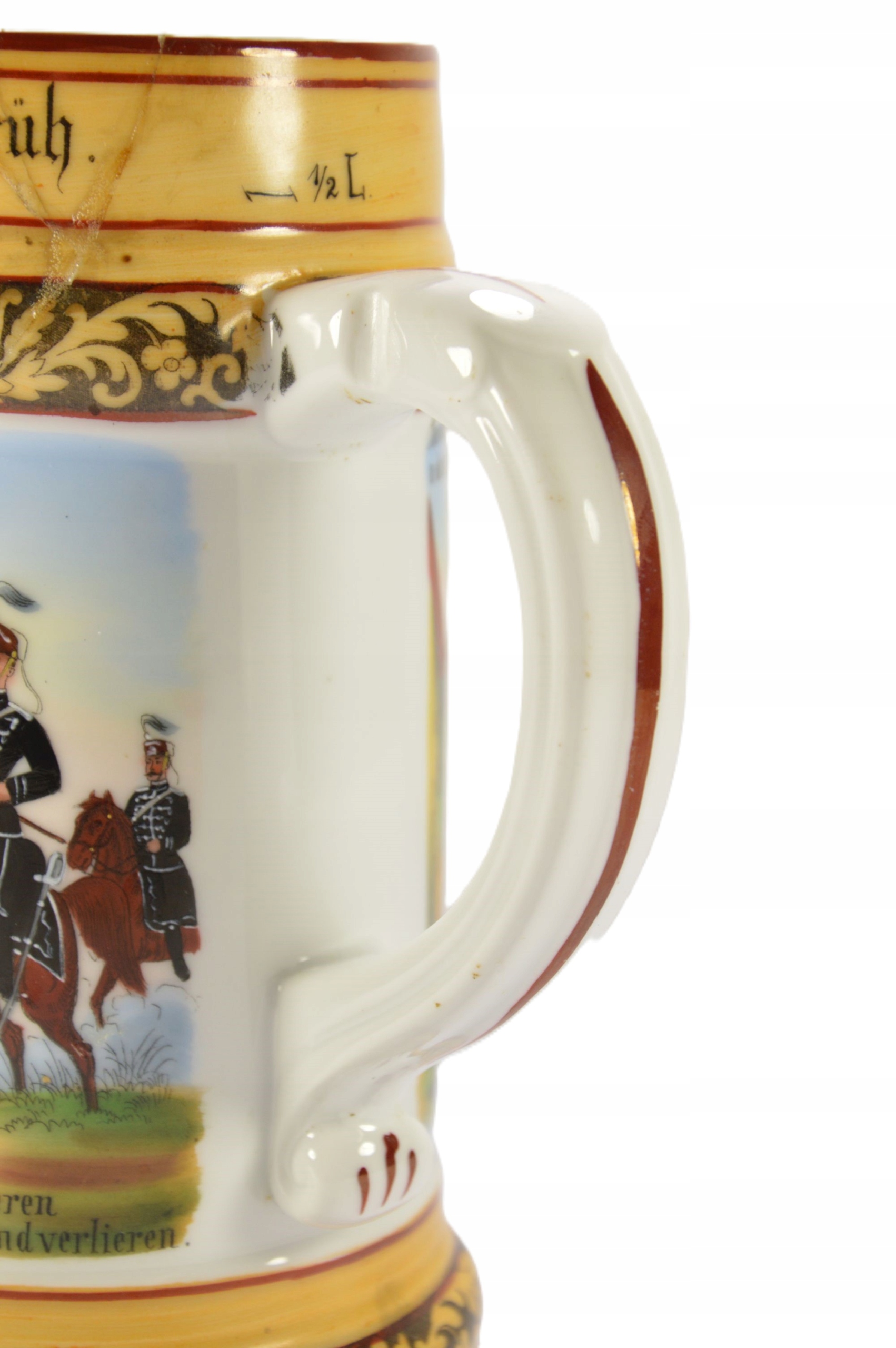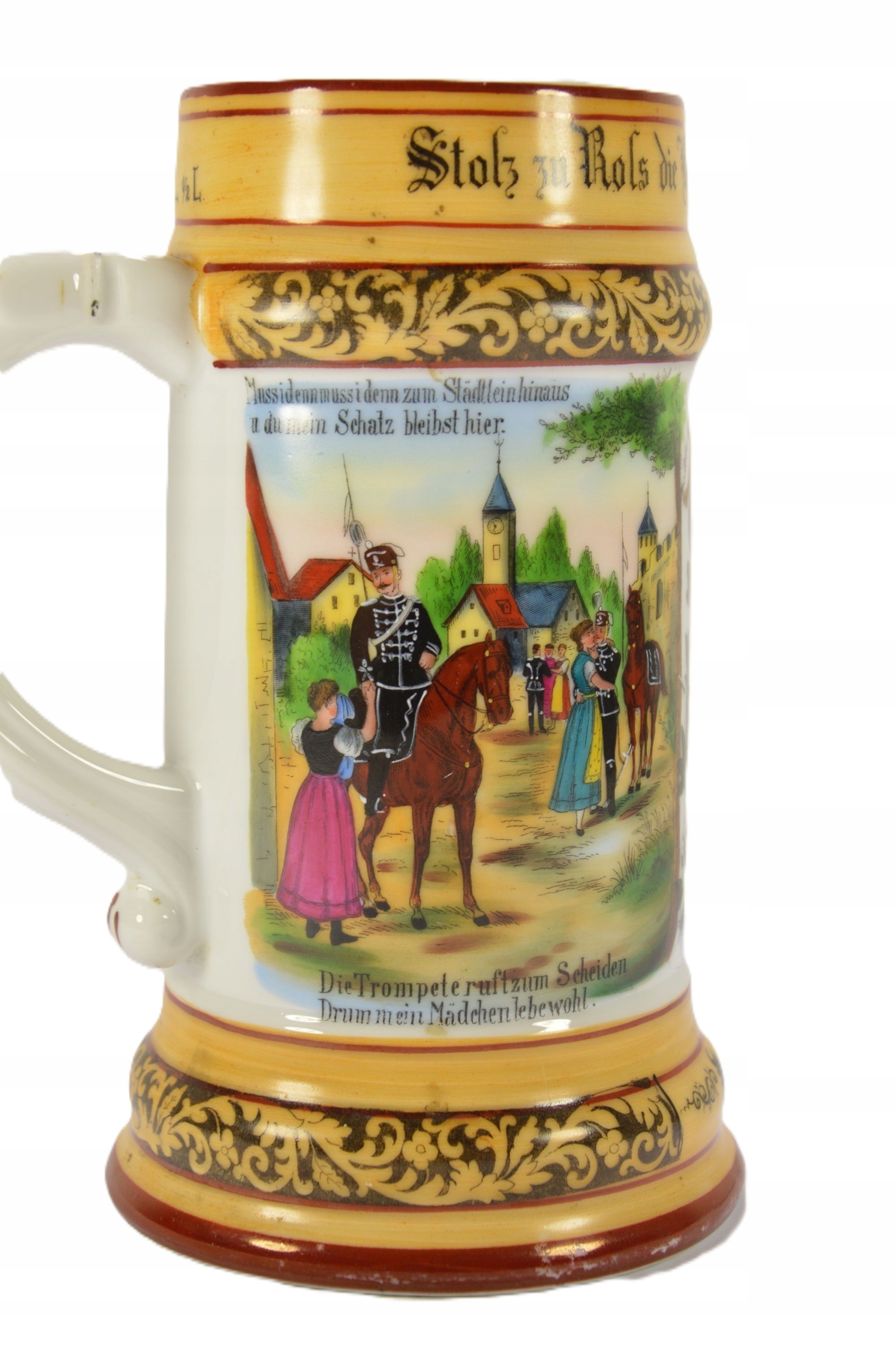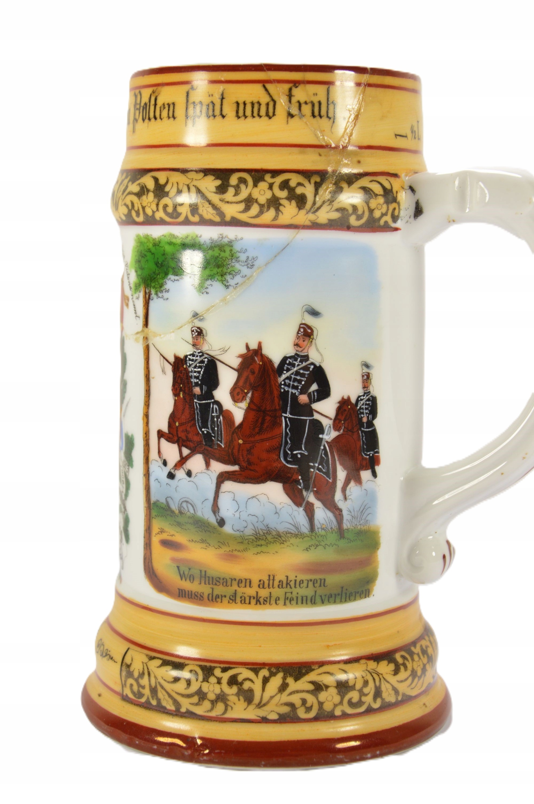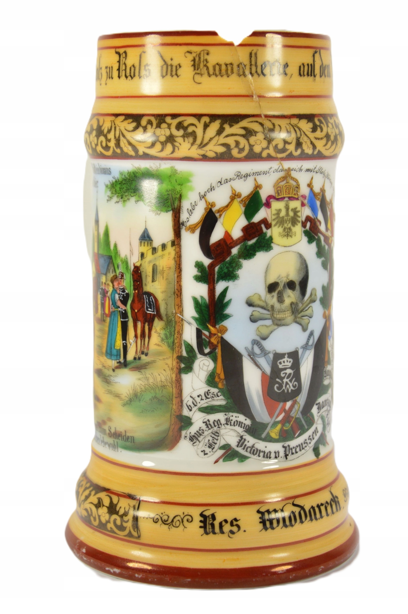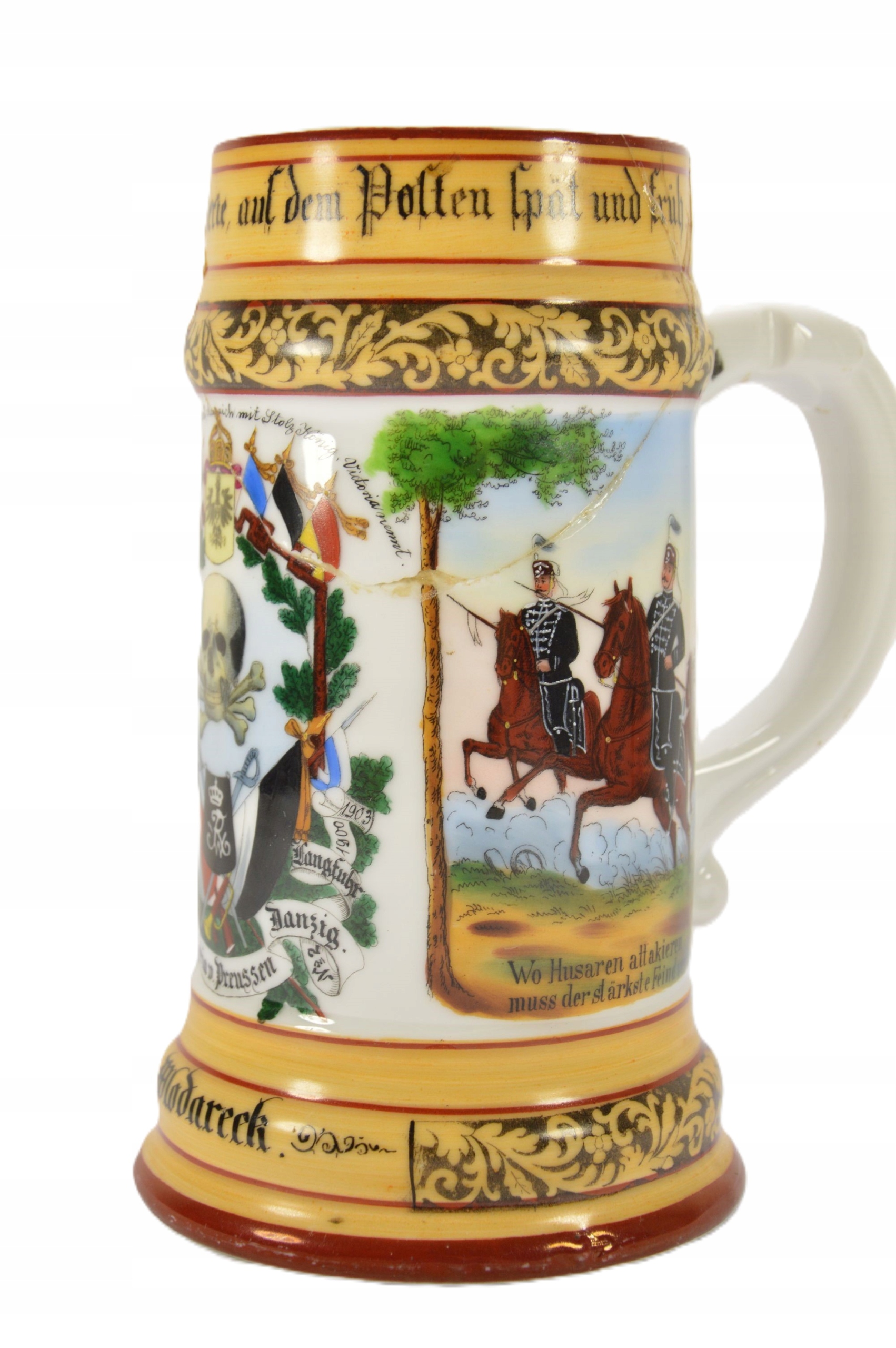Оригинальная, очень интересная и редкая кружка резервиста - 2-го адъютанта гусарского полка им. Королева Виктория Прусская, так называемая Гусары смерти. Полк дислоцировался в Гданьске-Вжеще, на кружке изображены сцены из жизни полка, мёртвая голова, характерная для формирования, подписи и датировка 1900-1903 гг. Кружка слегка потерта, склеена по краю, целостная, состояние прекрасно видно. на фотографиях. Оригинальная и очень интересная вещь той эпохи, рекомендую.