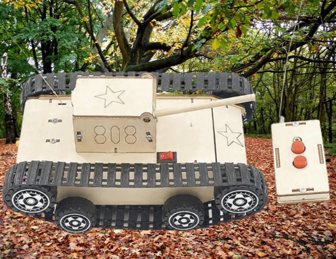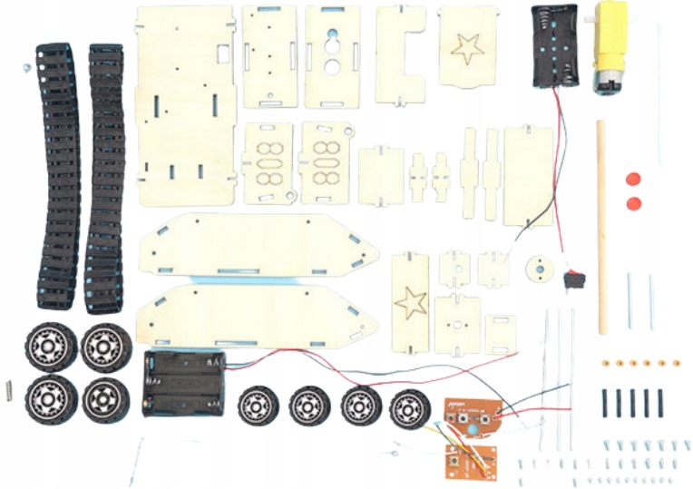 Набор состоит из нескольких элементов, включая деревянные бруски, двигатель, приводящий в движение танк, пульт дистанционного управления, провода, колеса и другие элементы, необходимые для сборки модели.