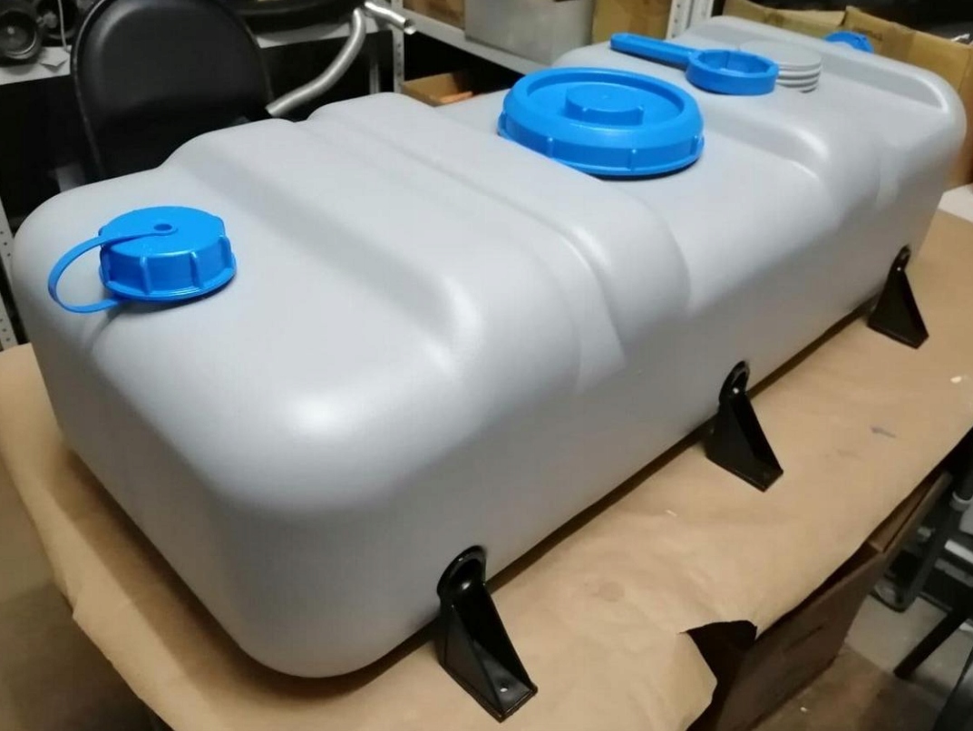 70L Танк, изготовленный из HDPE, одобренного для контакта с пищей (полиэтилен высокой плотности) с 2 Н. 61 гайками, 1 NW 170 гайками и одним DIN 96. Набор также включает в себя пробку, ключ и четыре монтажные скобки.