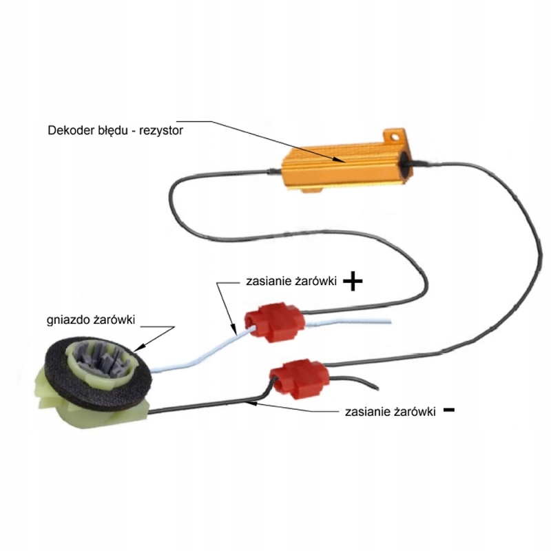Установка вне светильника, кабели не режем, просто подключаем один конец резистора к плюсу, а другой к минусу (речь идет о кабелях, питающих светодиодную лампочку), как если бы мы хотели сделать этим резистором короткое замыкание. Резистор следует крепить к металлическому элементу, чтобы он не сломался при езде и для лучшего охлаждения.