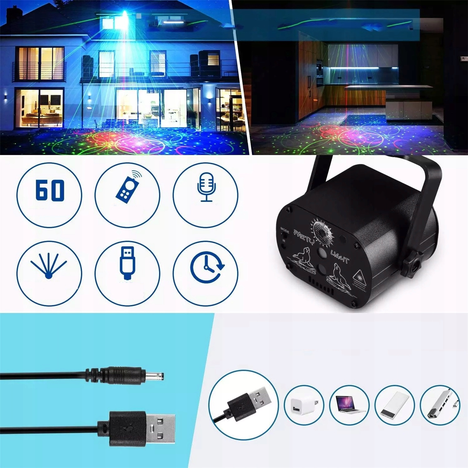 - Улучшите лазерное освещение вашей вечеринки, чтобы получить 60 комбинаций изображений, 6 цветов фона (красный, зеленый, синий, красный и зеленый, красный и синий, синий и зеленый) и 3 комбинации лучей (зеленый, красный, зеленый и красный),создавая более захватывающую атмосферу сцены за счет сочетания многофункциональных эффектов и качества проекции высокой четкости.