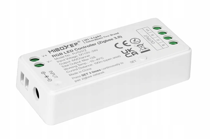 FUT037Z-это обновленная версия популярного контроллера FUN037. Светодиодный контроллер был расширен с помощью расширенной функции передачи сигнала и синхронизации, которая, одновременно поддержав 30 -метровые интервалы между последовательными устройствами, позволяет вам получить бесконечный диапазон. Параметры работы контроллера автоматически синхронизируются с другими продуктами в группе, это позволяет вам получить тот же эффект освещения, даже когда продукты запущены в другое время. Мощность контроллера была увеличена до 12А (144 Вт для установки 12 В и 288 Вт с установкой 24 В). Встроенный сигнальный диод позволяет быстро диагностировать и присвоить контроллера на пульт дистанционного управления без подключения светодиодной полосы. 2,4 ГГц.