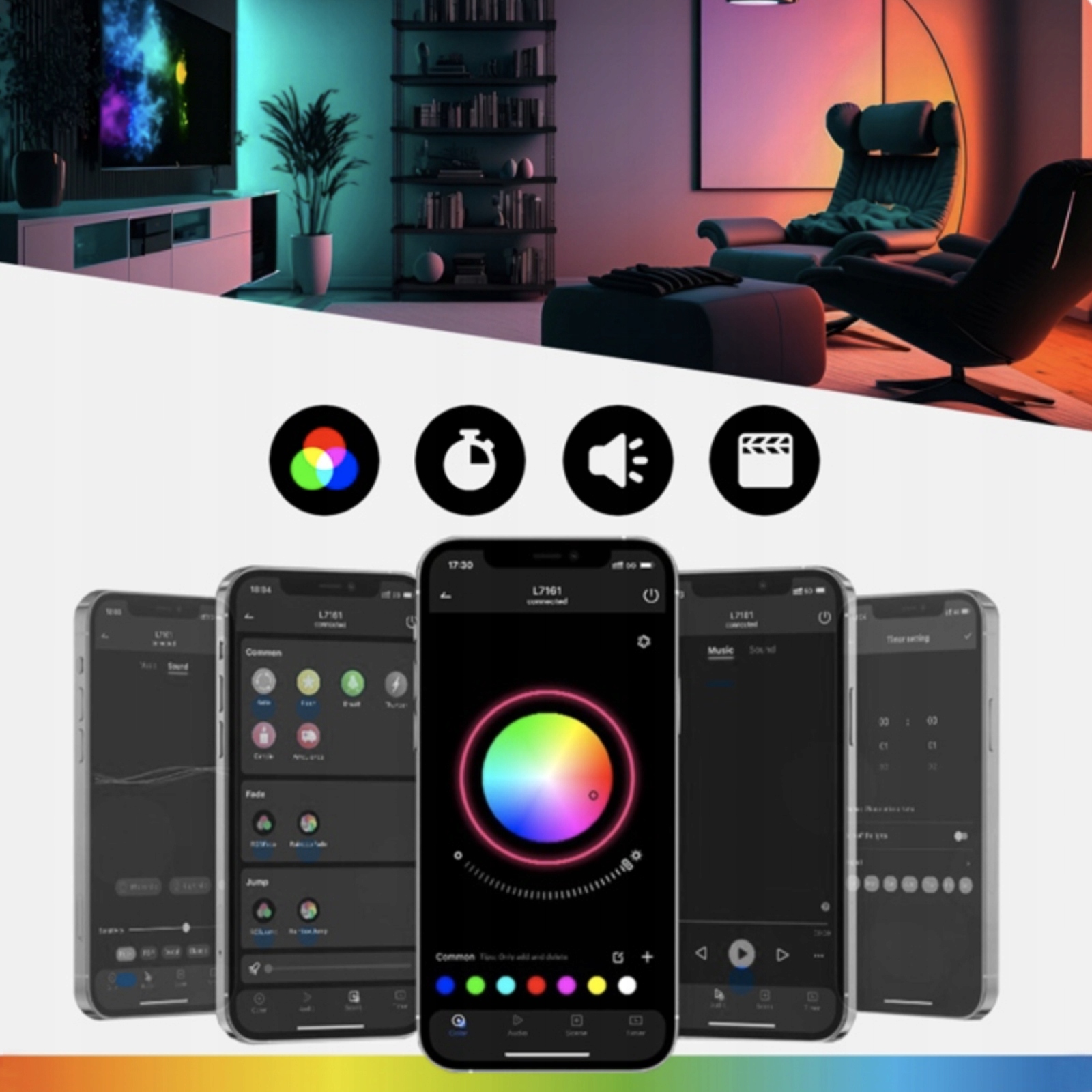 - 🌈【Синхронизация музыки】: Когда вы включаете музыкальный режим через приложение, светодиодный индикатор автоматически меняет ритм и звучание музыки. Он также имеет функцию времени.