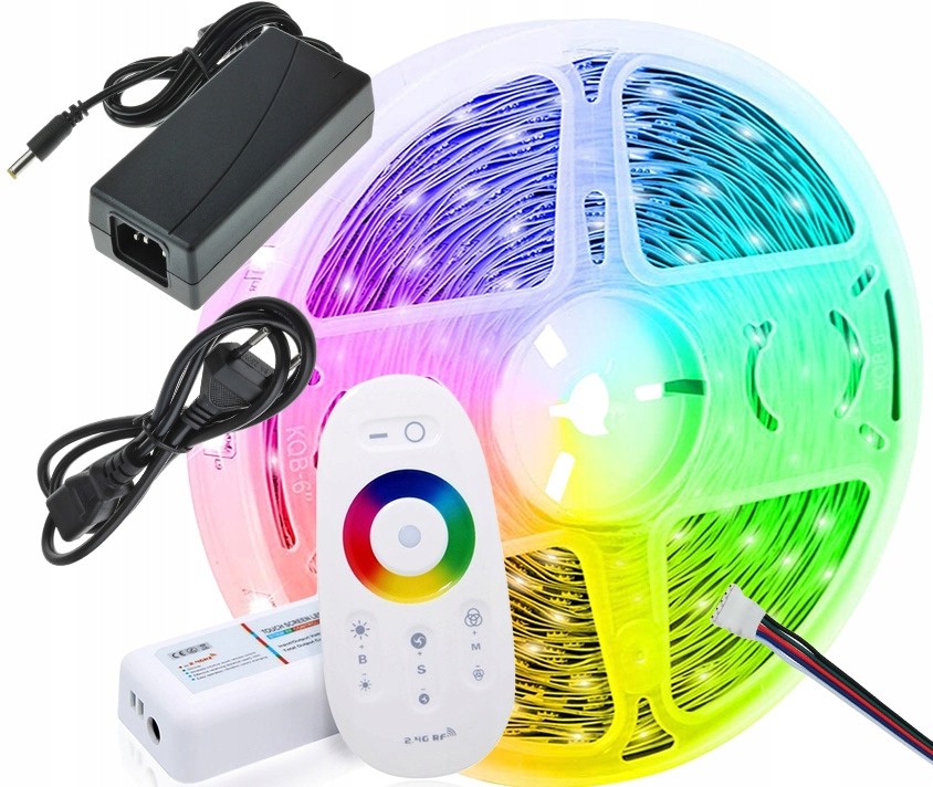 На 1 м ленты размещается 60 диодов - 30 RGB SMD5050 и 30 White SMD5050. Лента выпускается в рулонах по 5 метров. На каждой секции, т.е. 5 м ленты, размещено 300 светодиодов SMD 5050 - 150 светодиодов RGB и 150 светодиодов белого цвета (теплого или холодного). Его можно разрезать на более мелкие части в специально отведенных для этого местах. Сегменты, позволяющие разрезать ленту, располагаются через каждые 10 см. Такой модуль состоит из трех светодиодов RGB, трех белых светодиодов и резистора, которые последовательно размещены на гибкой белой подложке печатной платы.