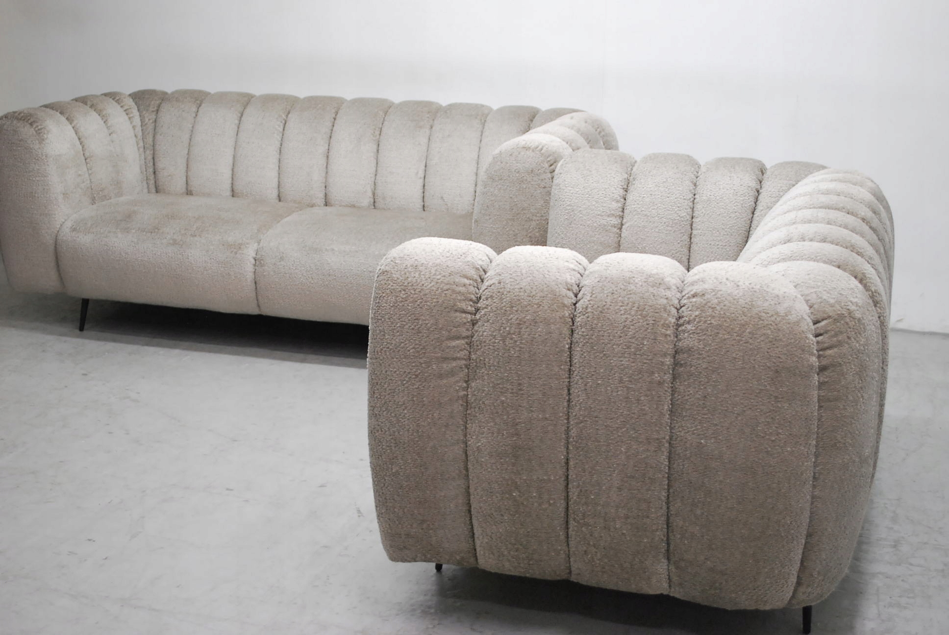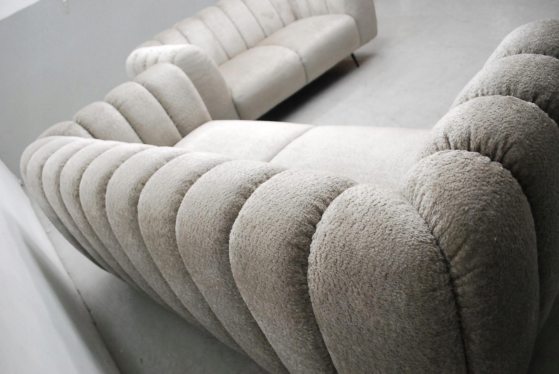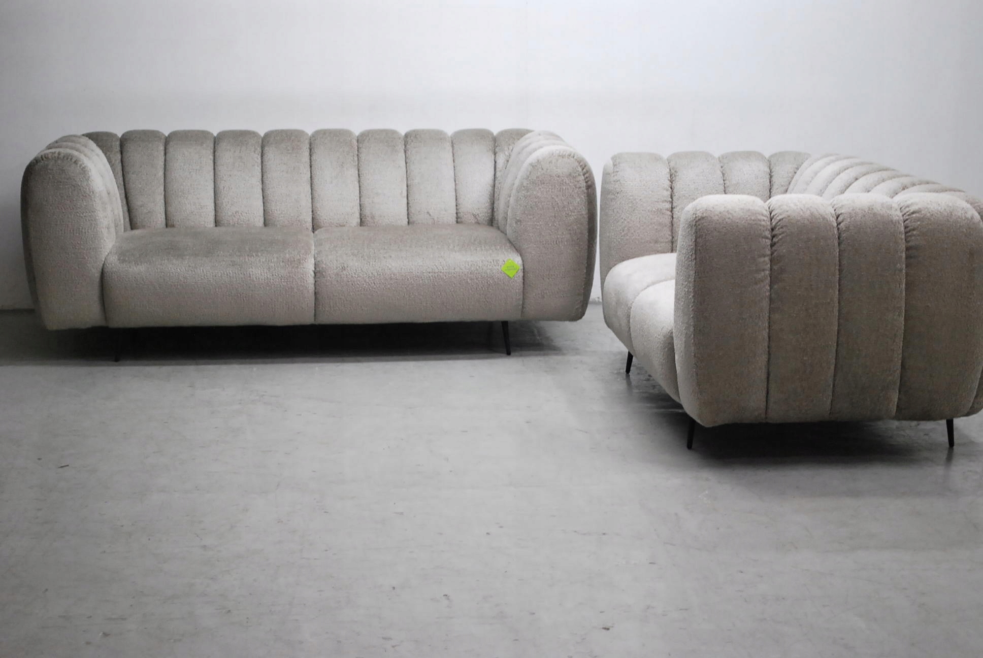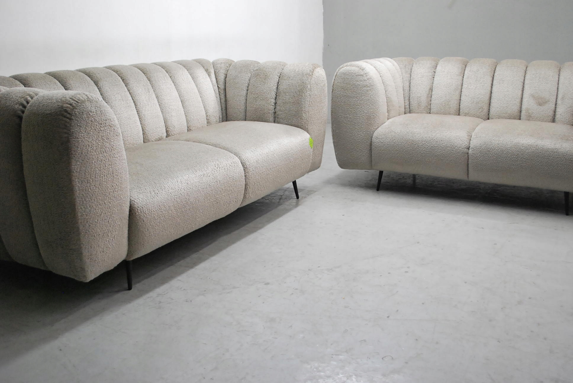 Комплект абсолютно новый, выполнен из качественной, плотной ткани типа бархатной замши. Ткань очень приятная на ощупь. Дополнительным преимуществом этого материала является устойчивость к скатыванию и высокая стойкость к истиранию. Диваны не имеют функции сна. Комплект выполнен в светло-серо-коричневом цвете.
