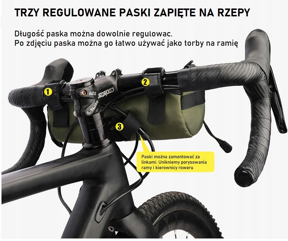 Сумка изготовлена из очень прочного и легкого материала. . Крепится к велосипеду тремя ремнями-липучками. Дополнительный ремень для ношения на плече. На передней части сумки имеется шнурок, к которому можно прикрепить карту или другие мелкие предметы. Дополнительно тубус оснащен светоотражающими полосками.