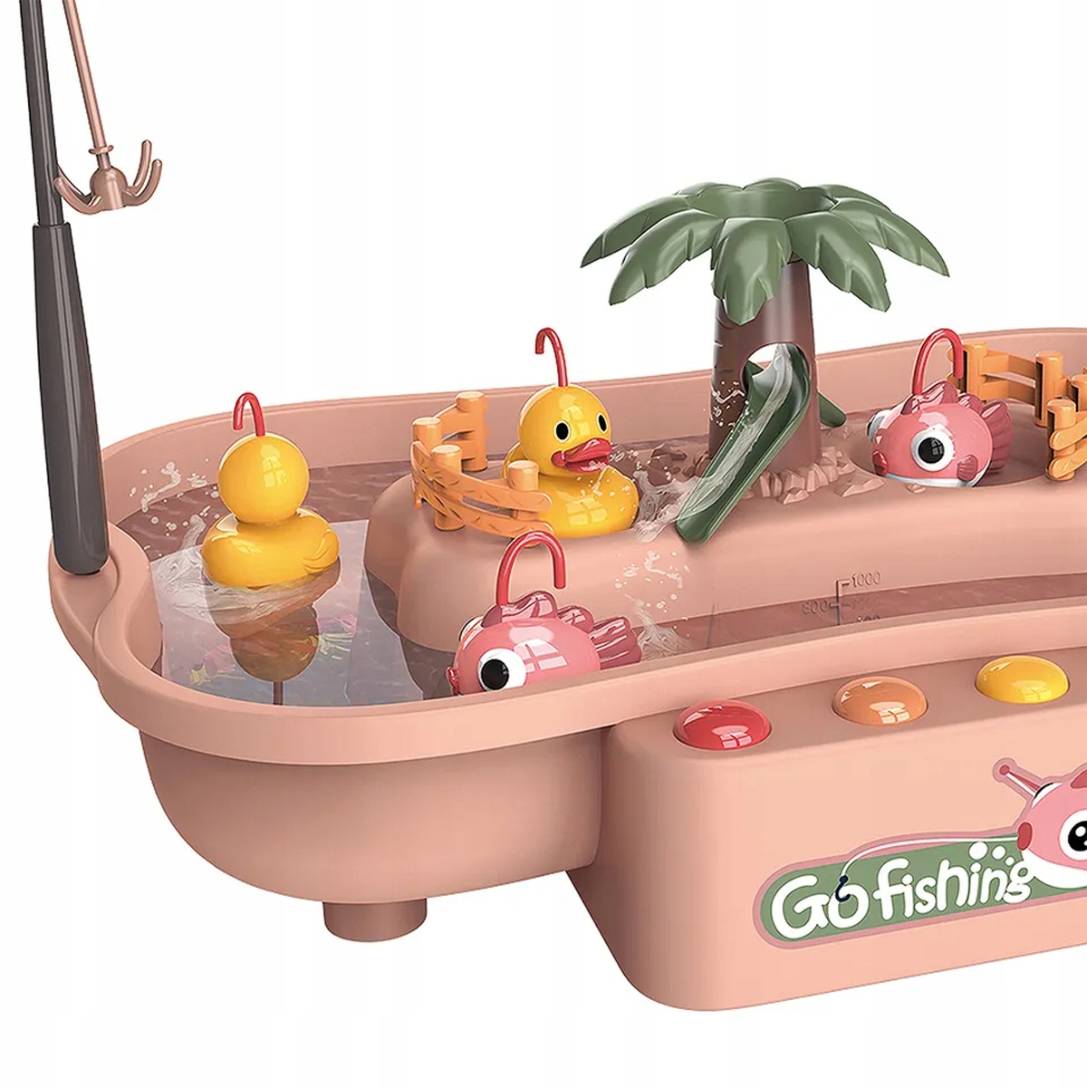 После включения игрушки у нас появится на выбор несколько веселых мелодий. Мотор создаст поток воды, благодаря которому рыбки и утки будут плавать вокруг пруд.