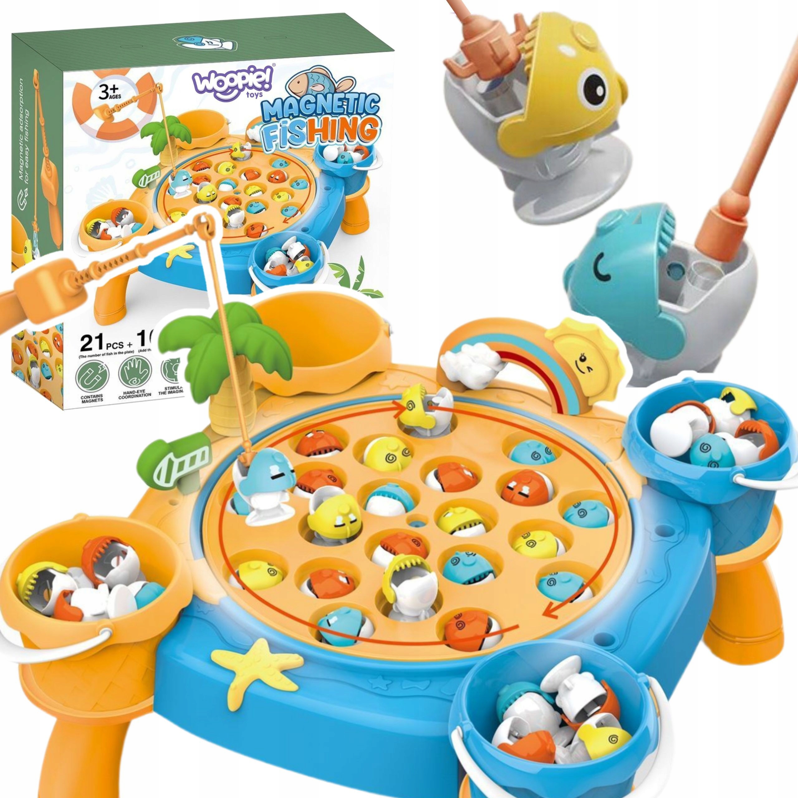 Магнитный рыболовный набор от бренда WOOPIE — игрушка, имитирующая рыбалку, но с использование магнитов. Он состоит, среди прочего, из удочки с магнитом, которой можно ловить рыбу с помощью металлических элементов, а затем мы помещаем пойманную рыбу в прикрепленные ведра на доска. Эта игра направлена на развитие ловкости рук, зрительно-моторной координации и точности. Это также игра, которую можно использовать для изучения цветов, форм и счета, поскольку рыбы различаются по цвету и форме. Рыбалка — популярная игрушка для детей дошкольного и младшего школьного возраста, которая одновременно развлекает и развивает когнитивные и моторные навыки. Кроме того, это безопасная альтернатива традиционной рыбалке, особенно для детей, которые еще не готовы к настоящей рыбалке.