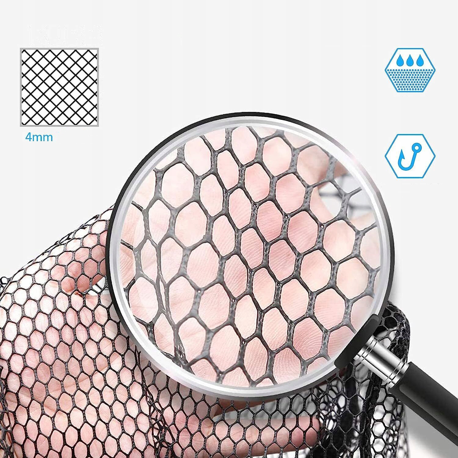 🐟【Высококачественный материал】Прочная сетка шестиугольной структуры делает рыболовную сеть прочной и долговечной. Выдвижная алюминиевая штанга, нескользящая и удобная резиновая ручка. Специальные материалы не повреждают рыбью чешую и эффективно предотвращают развитие бактерий и неприятных запахов. Изготовлен из прочной нейлоновой сетки толщиной 4 мм.