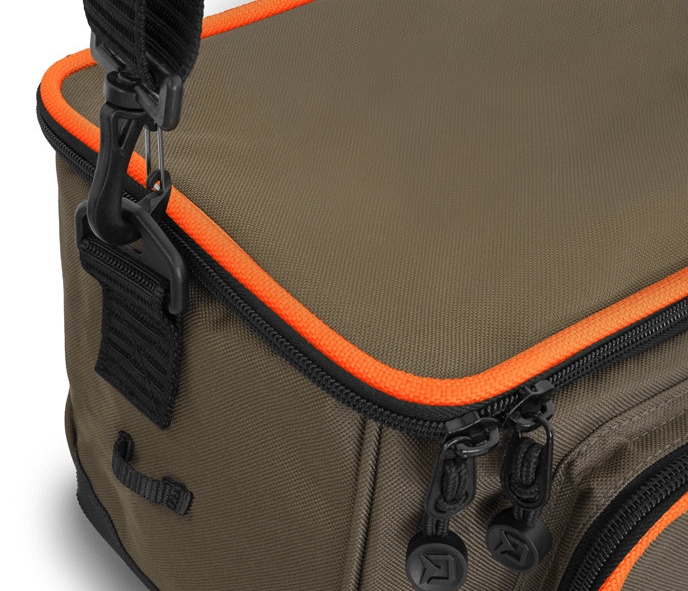 Сумка изготовлена из прочных высококачественных материалов. Дополнительно нижняя часть защищена резиновым слоем, защищающим от влаги с земли. Основное место хранения оснащено прозрачным пластиковым ящиком с регулируемыми перегородками, поэтому вы всегда будете знать, что находится внутри. Эта коробка подойдет для спиннингов, кормушек или других мелких аксессуаров.