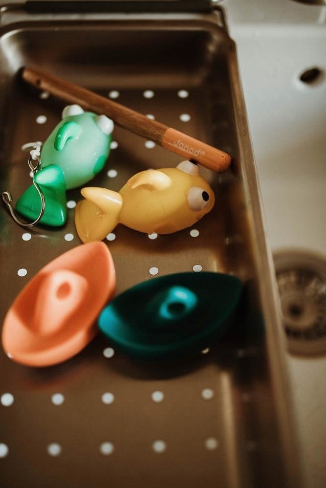 Набор для рыбалки в ванне от французского бренда JANOD состоит из 2 резиновых рыбок, 2 резиновых парусников и удобной деревянной удочки с сейфом (закругленной формы). конец) с крючком.