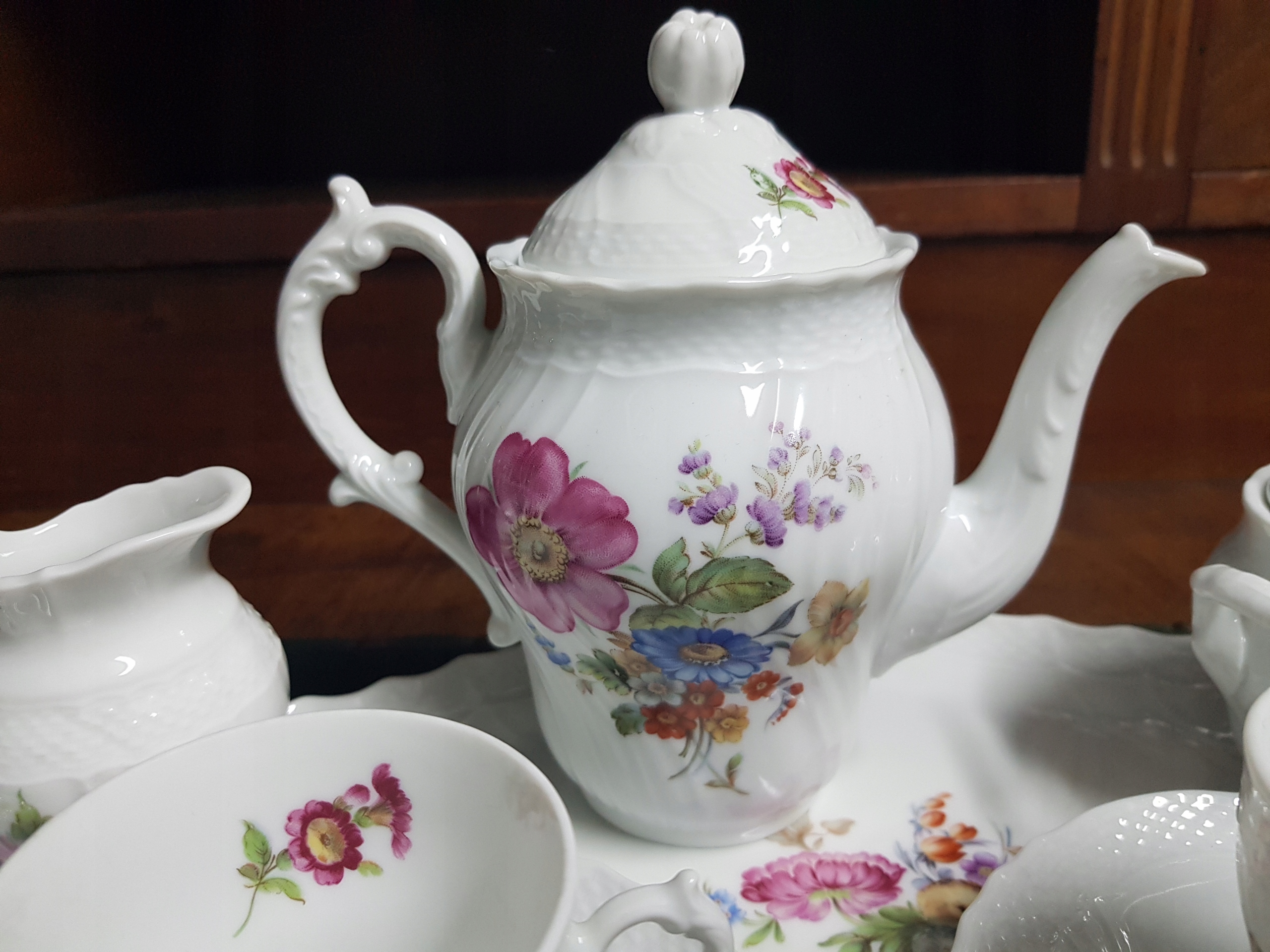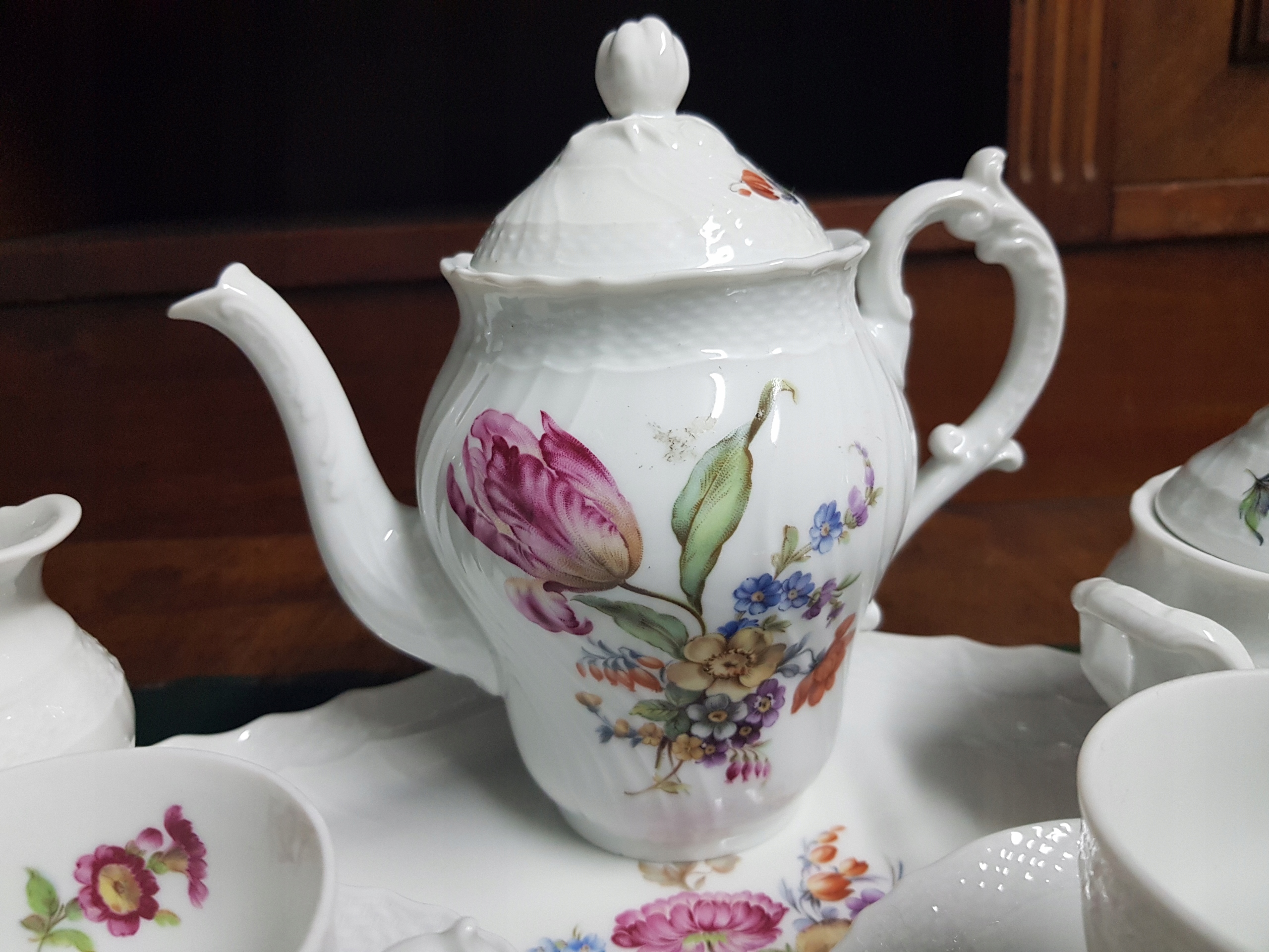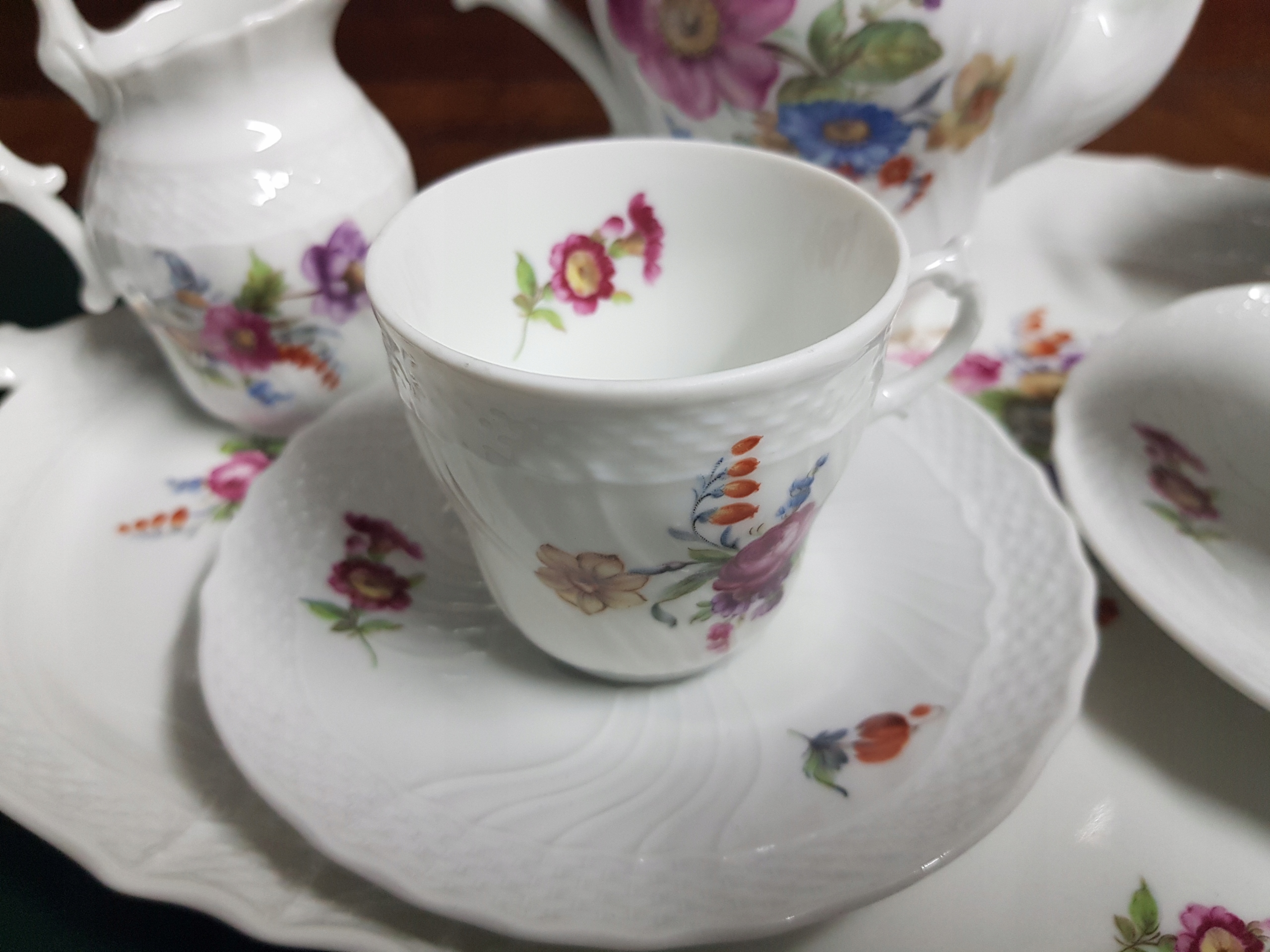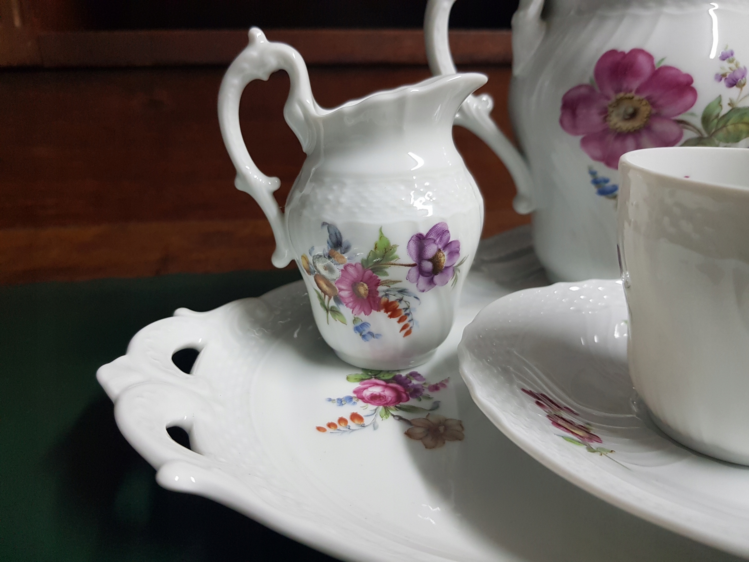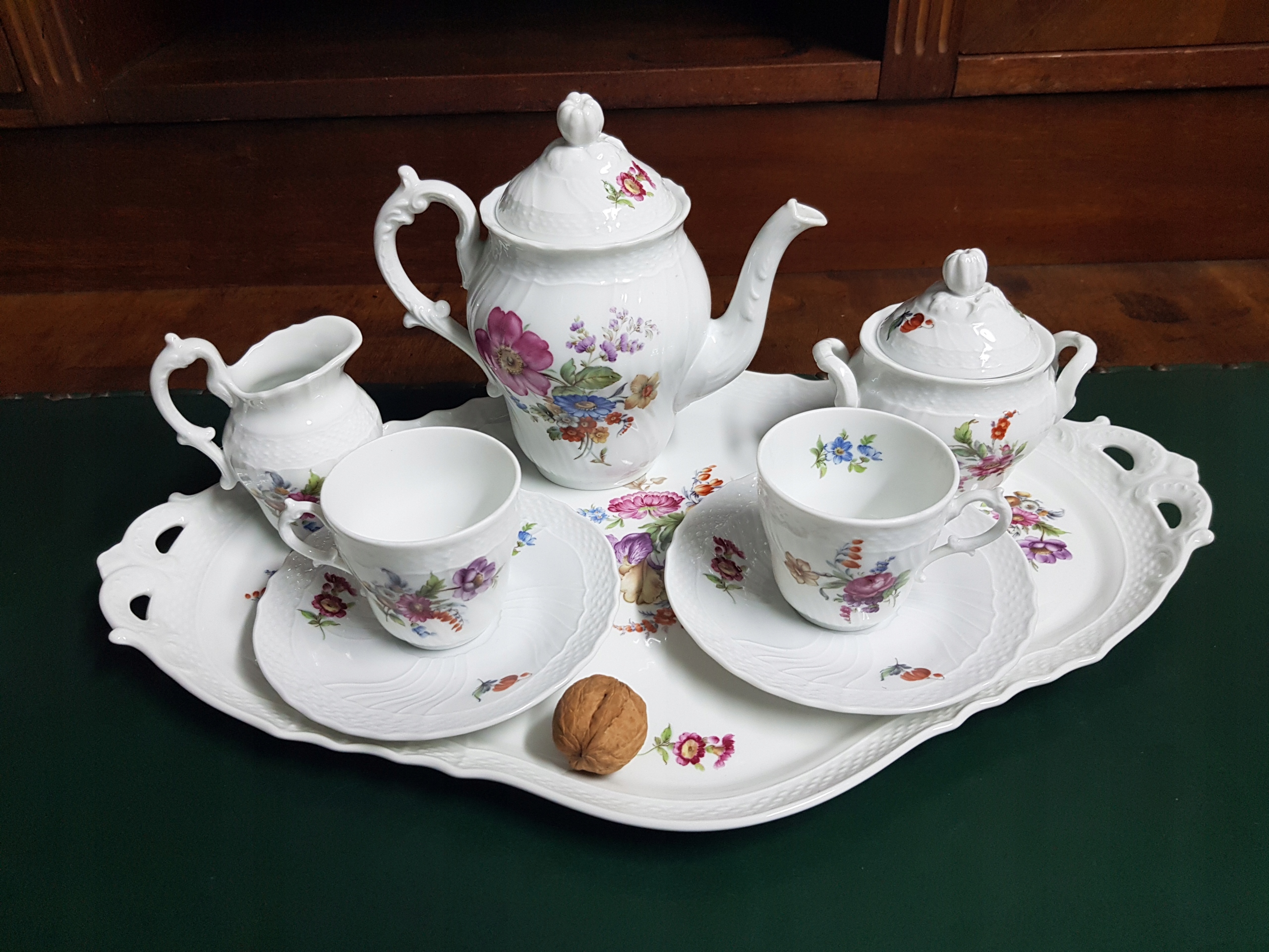 Предметом аукциона является сервиз мокко на двоих от Richard Ginori Италия.В комплект входит большой поднос, кувшин, сахарницы, молочник, 2 чашки, 2 блюдца.Белый фарфор, украшенный цветочными мотивами. Рельефы на поверхности фарфора./p>