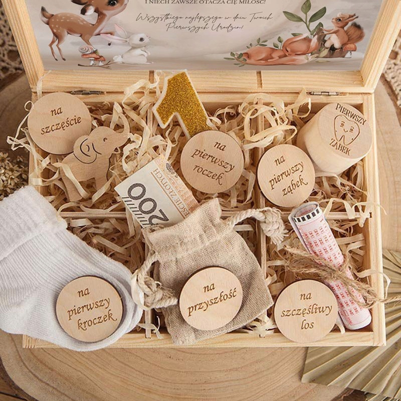 - Подарок на первый день рождения для ребенка девочка и мальчик помещены в деревянный ящик, на котором расположены символы, обозначающие первые мгновения жизни ребенка!