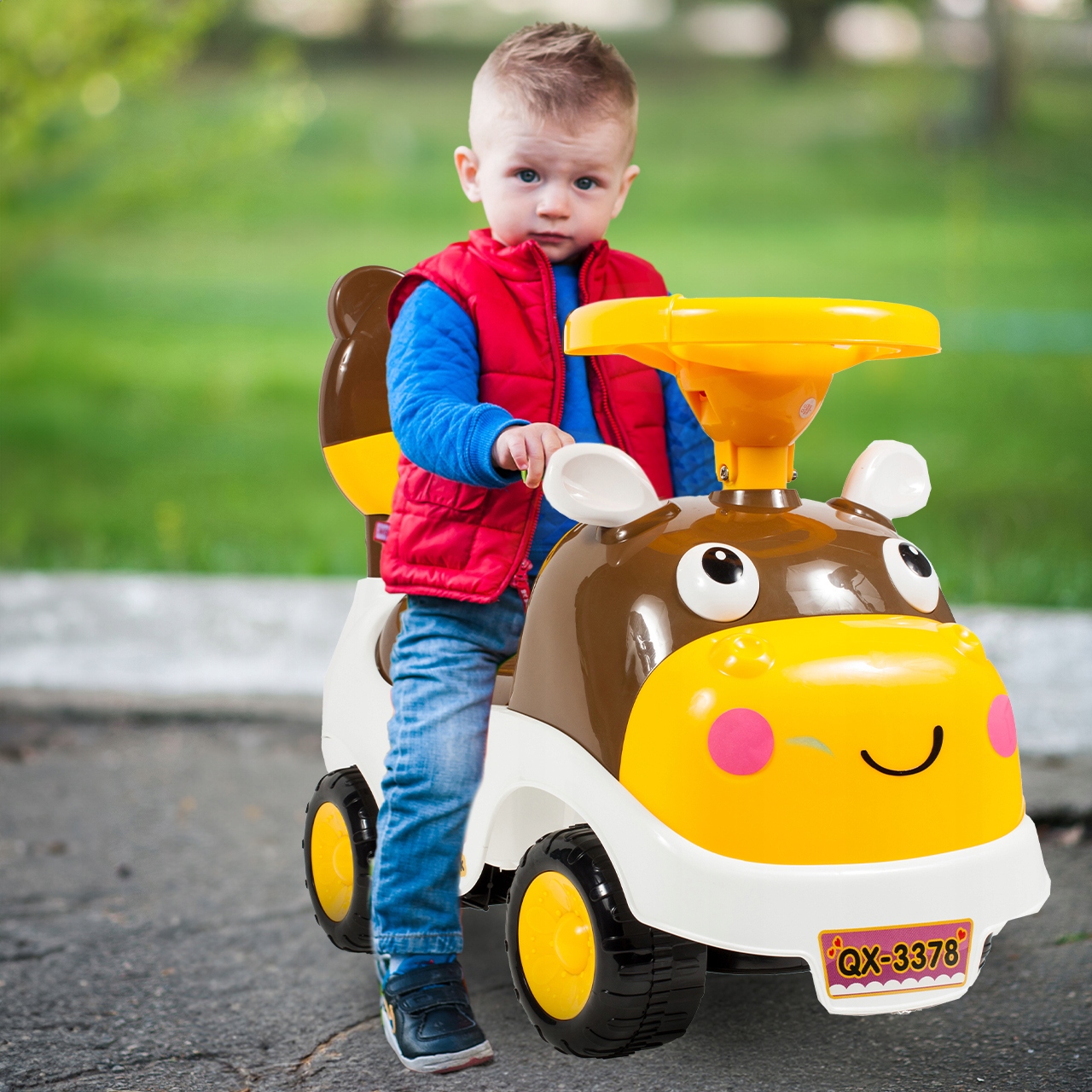 Симпатичная на вид корова с улыбающейся мордашкой доставит массу удовольствия вашему ребенку. Он оснащен вещевым отделением под сиденьем, звуковым сигналом на руле и удобным сиденьем со съемной спинкой.