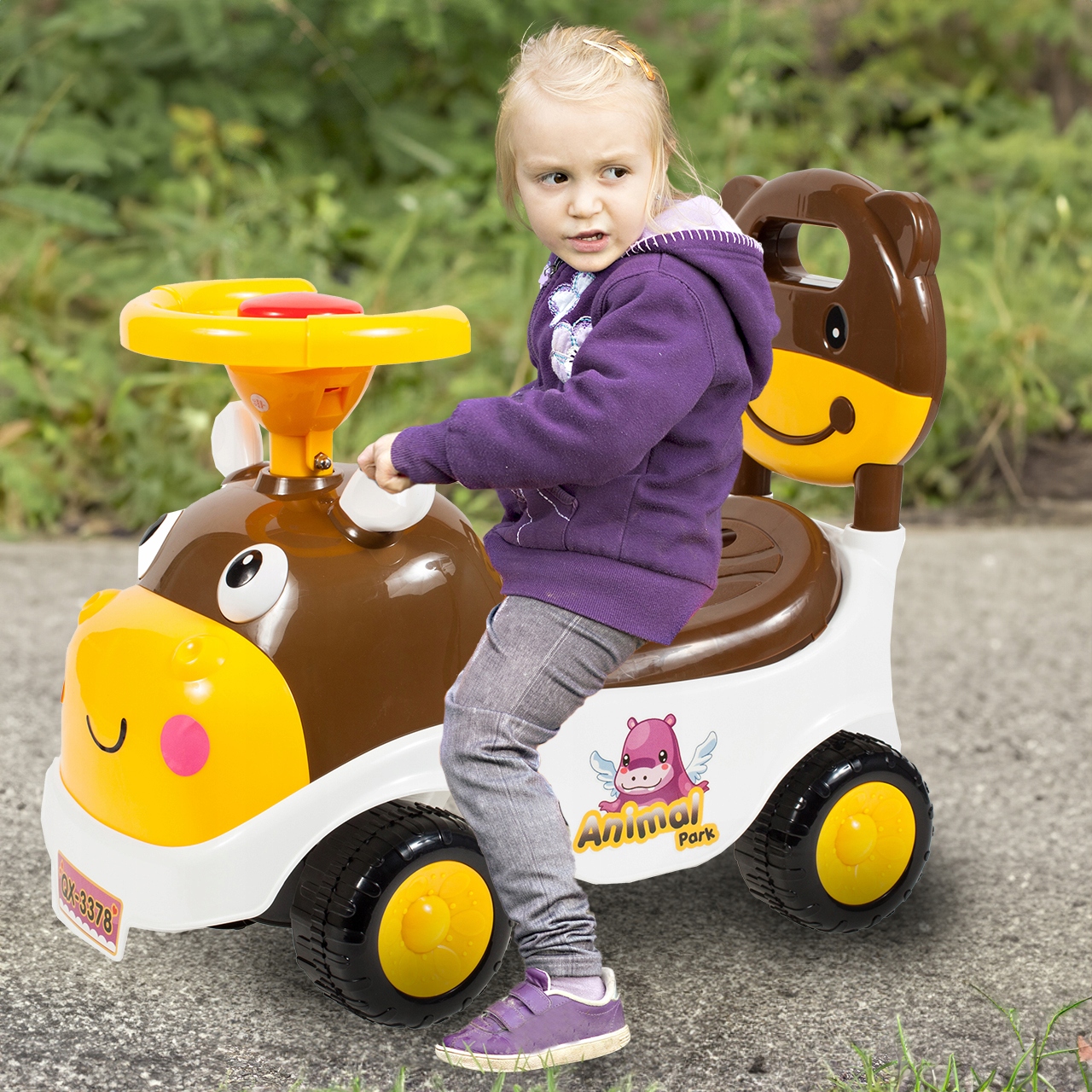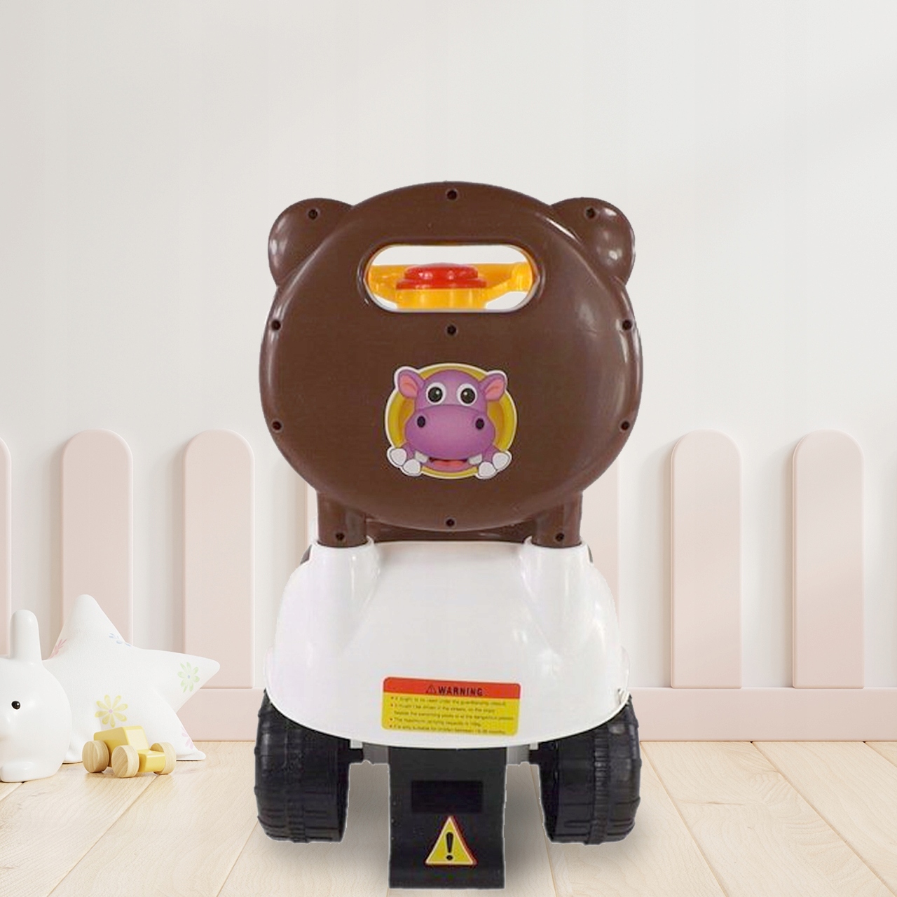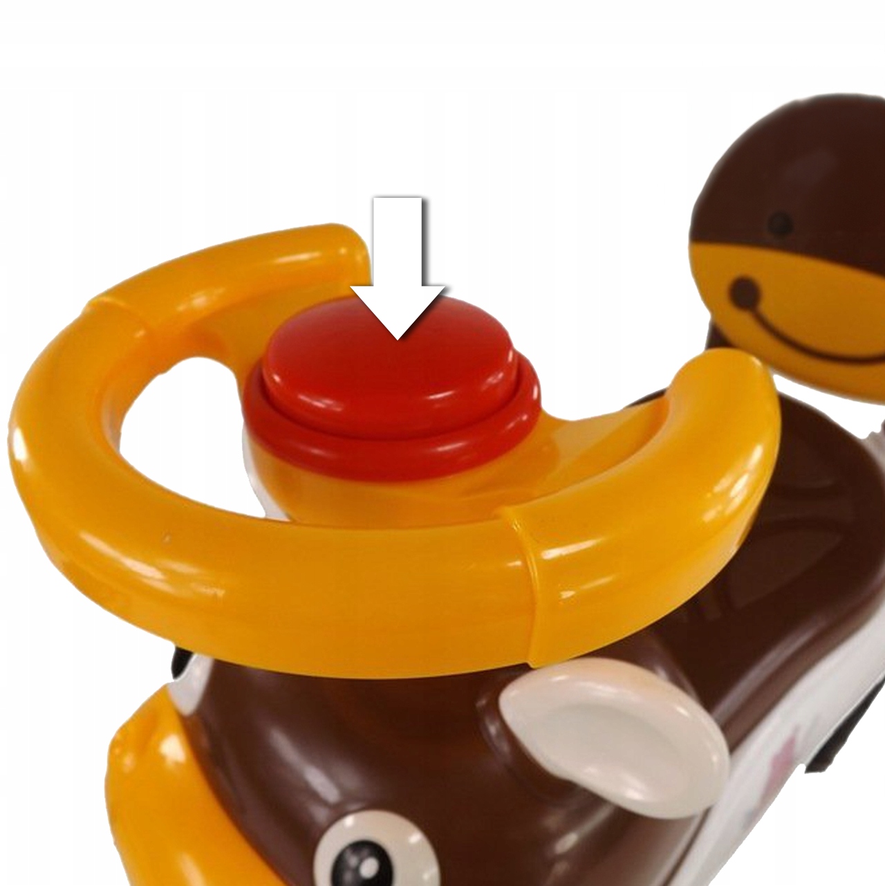 Симпатичная на вид корова с улыбающейся мордашкой доставит массу удовольствия вашему ребенку. Он оснащен вещевым отделением под сиденьем, звуковым сигналом на руле и удобным сиденьем со съемной спинкой.